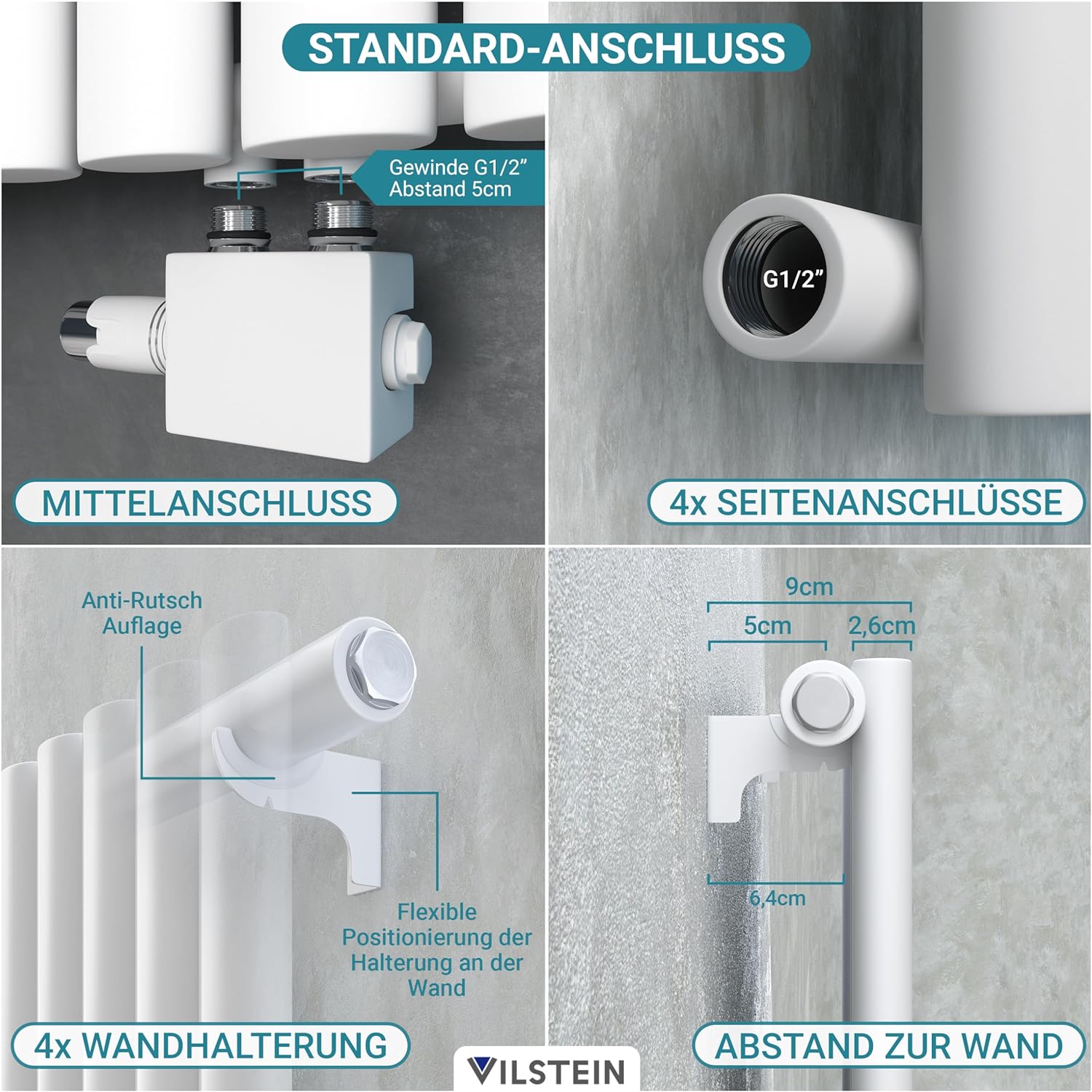 - Mittel- und Seitenanschluss: Der Heizkörper verfügt über einen Mittelanschluss sowie über einen Seitenanschluss und kann daher nach Belieben installiert werden. Entsprechende Ventile zum Schliessen der übrigen Anschlüsse sind bereits im