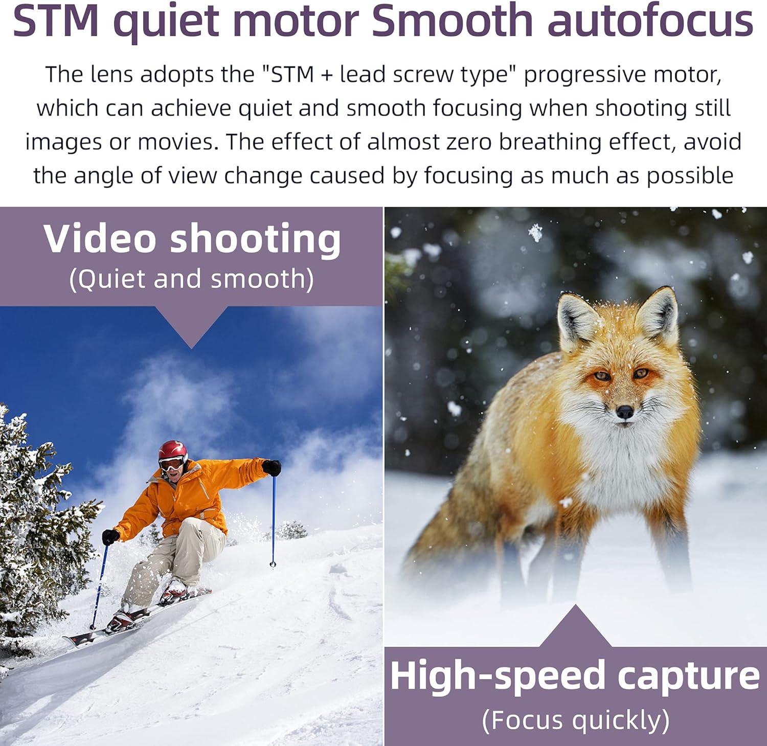 • 【Leiser STM-Motor】 Mit dem Schrittmotor vom Typ STM-Leitspindel kann beim Aufnehmen von Standbildern und Filmen eine leise und gleichmässige Fokussierung erreicht werden. Nahezu kein Atmungseffekt, um Änderungen des Betrachtungswinkels durch