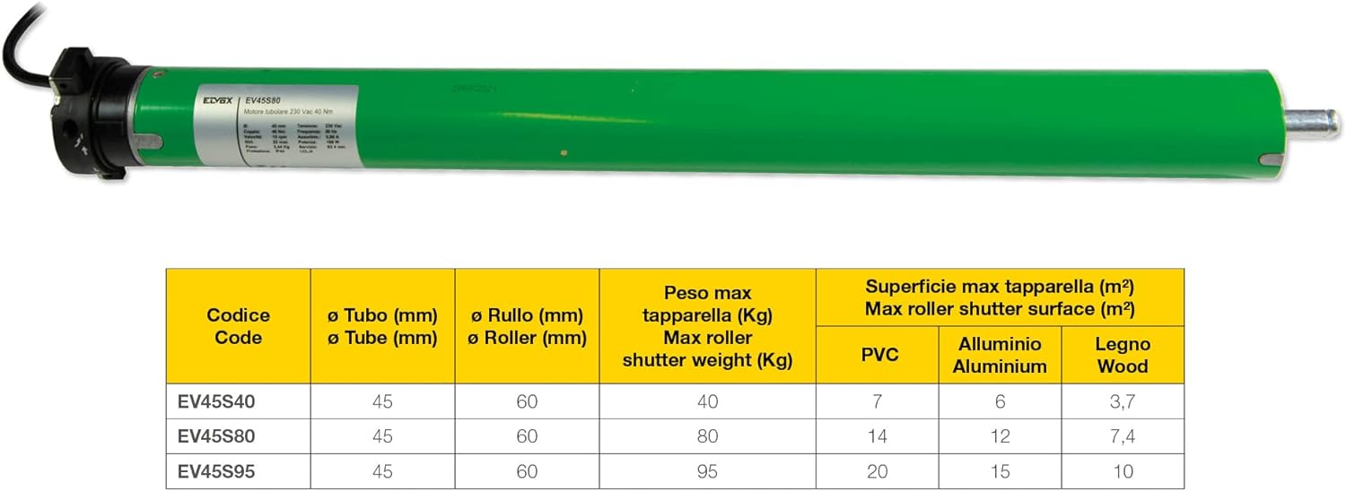 - Vimar EV45S80 Rolladenmotor 230 V~, Hubkapazität 80 kg, Wohn-, Gewerbe- und Tertiäranwendung, 60 mm Achtkantadapter, komplett mit Befestigungsklammern
