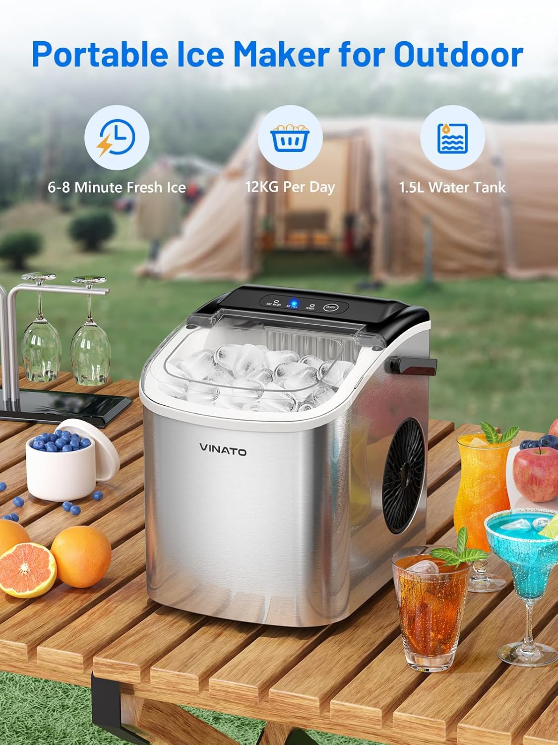 • Blitzschnelle Eisproduktion: Die VINATO Eiswürfelmaschine Gastro erzeugt 9 glatte Bullet-Eiswürfel pro Zyklus in nur 6-8 Minuten. Mit 110 Watt Leistung produziert sie bis zu 12 kg/26 lbs Eis am Tag - ideal für Getränke, Partys oder Outdoor-Camping
