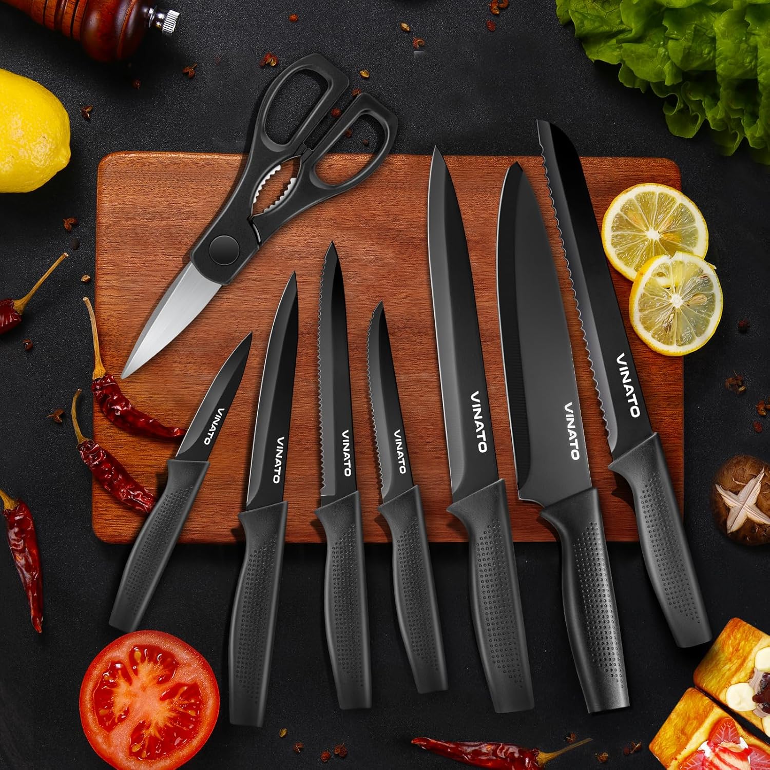 - 【Hochwertiges Messerset】Premium-Edelstahlklingen mit schwarzer BO-Oxid-Technologie und keramischer Antihaftbeschichtung auf den Klingen machen das Schneiden einfacher und die Klingen bleiben länger scharf. Küchenprofi-Messer set ist praktisch,