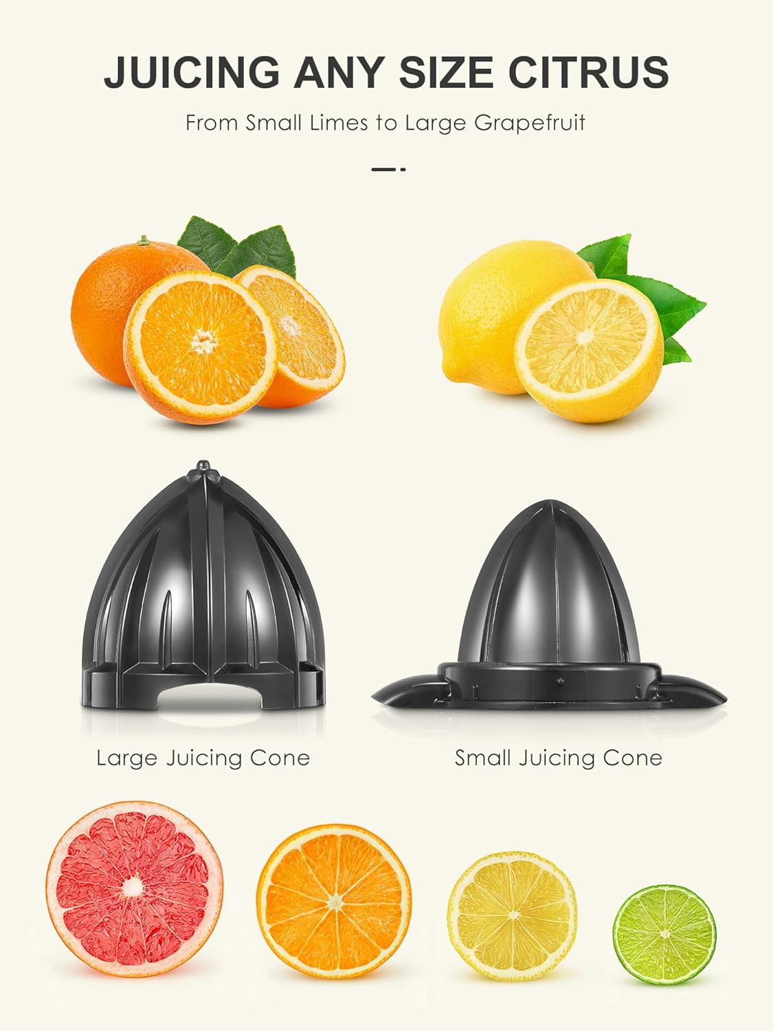 - 2 Presskegel: Das kompakte Design der Saftpresse nimmt wenig Platz weg, und das hochwertige Edelstahlgehäuse macht die elektrische Edelstahl-Zitruspresse besonders robust und langlebig. Dank der 2 mitgelieferten Presskegel kann die Zitruspresse