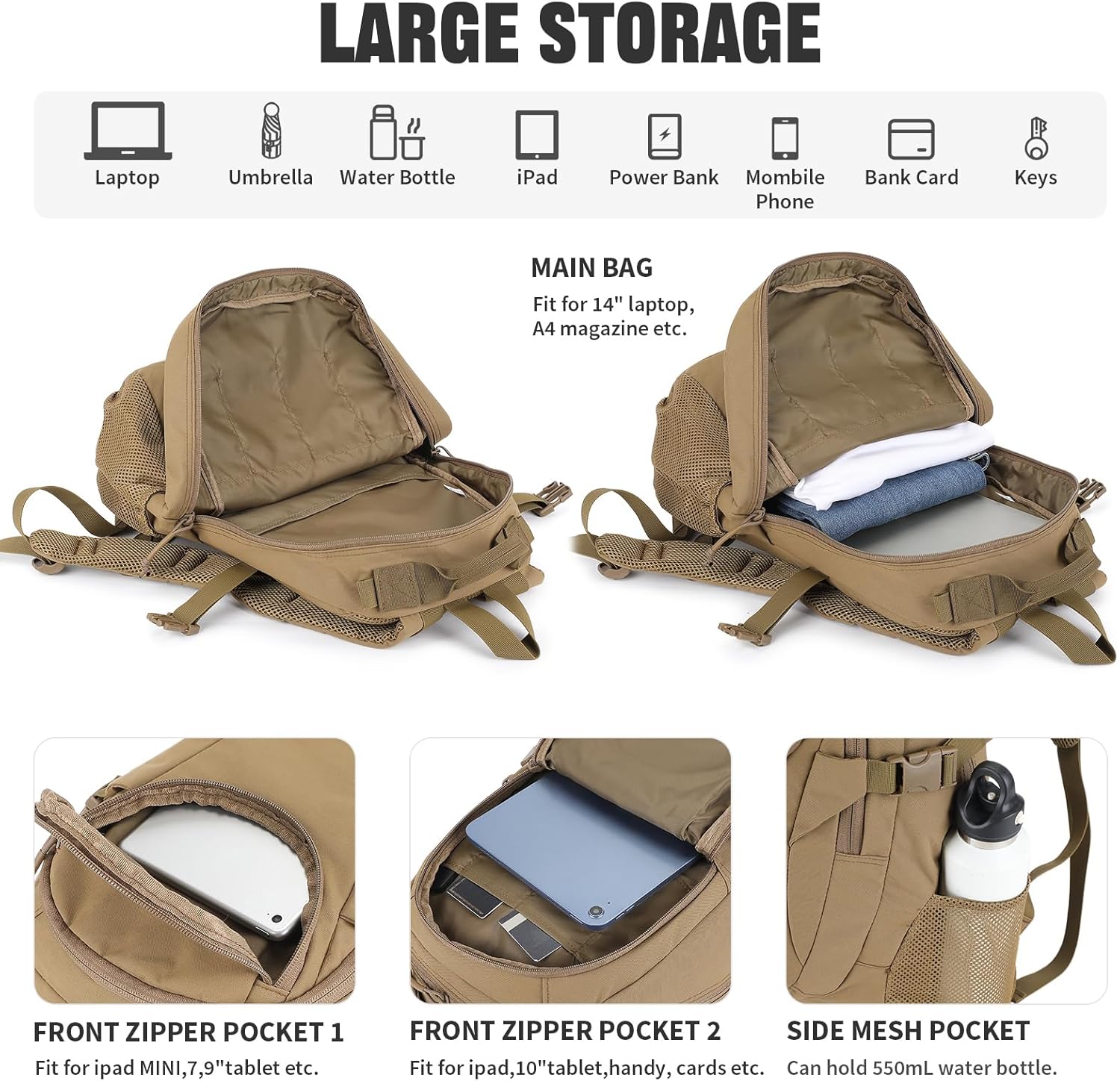 - Grosse Kapazität: 25L. Haupttasche kann 14 Zoll Laptop und A4 Format Dateien, Front-Reissverschluss Tasche fit für iPad Mini oder 7,9 "Tablette, beide Seiten Mesh-Taschen fit für 553ml Wasserflasche.