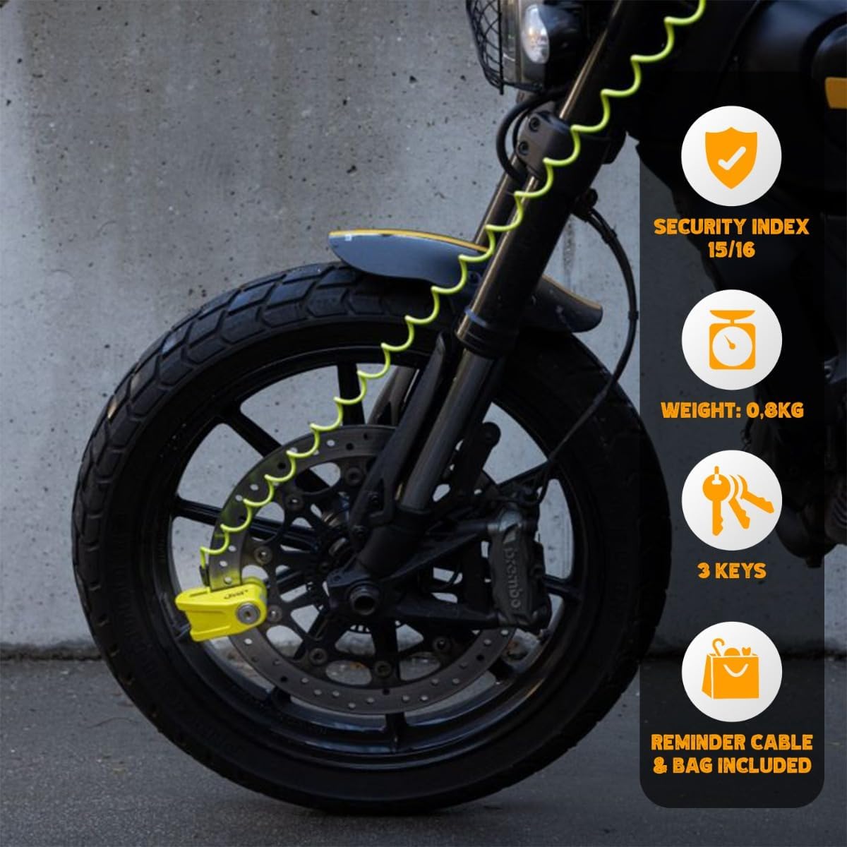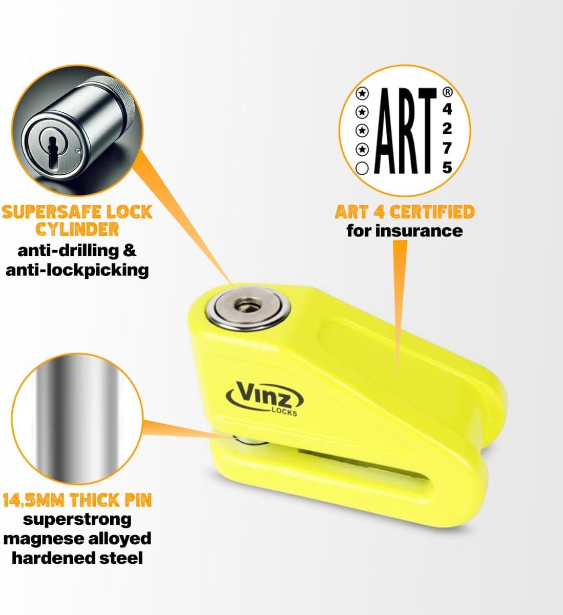 - HOHE QUALITÄT UND SCHUTZ - Das VINZ Baretti Bremsscheibenschloss mit Alarm besteht aus beständigem, gehärtetem Stahl mit einer Stiftstärke von 14,5mm. Dieses Schloss ist Wasserdicht, fallschutz, korrosionsschutz und widerstandsfähig gegen hohe