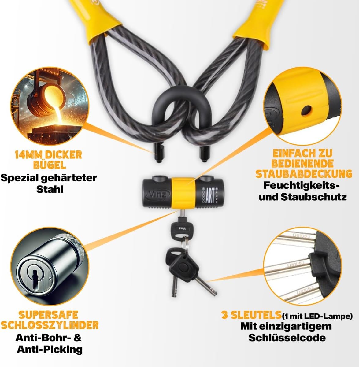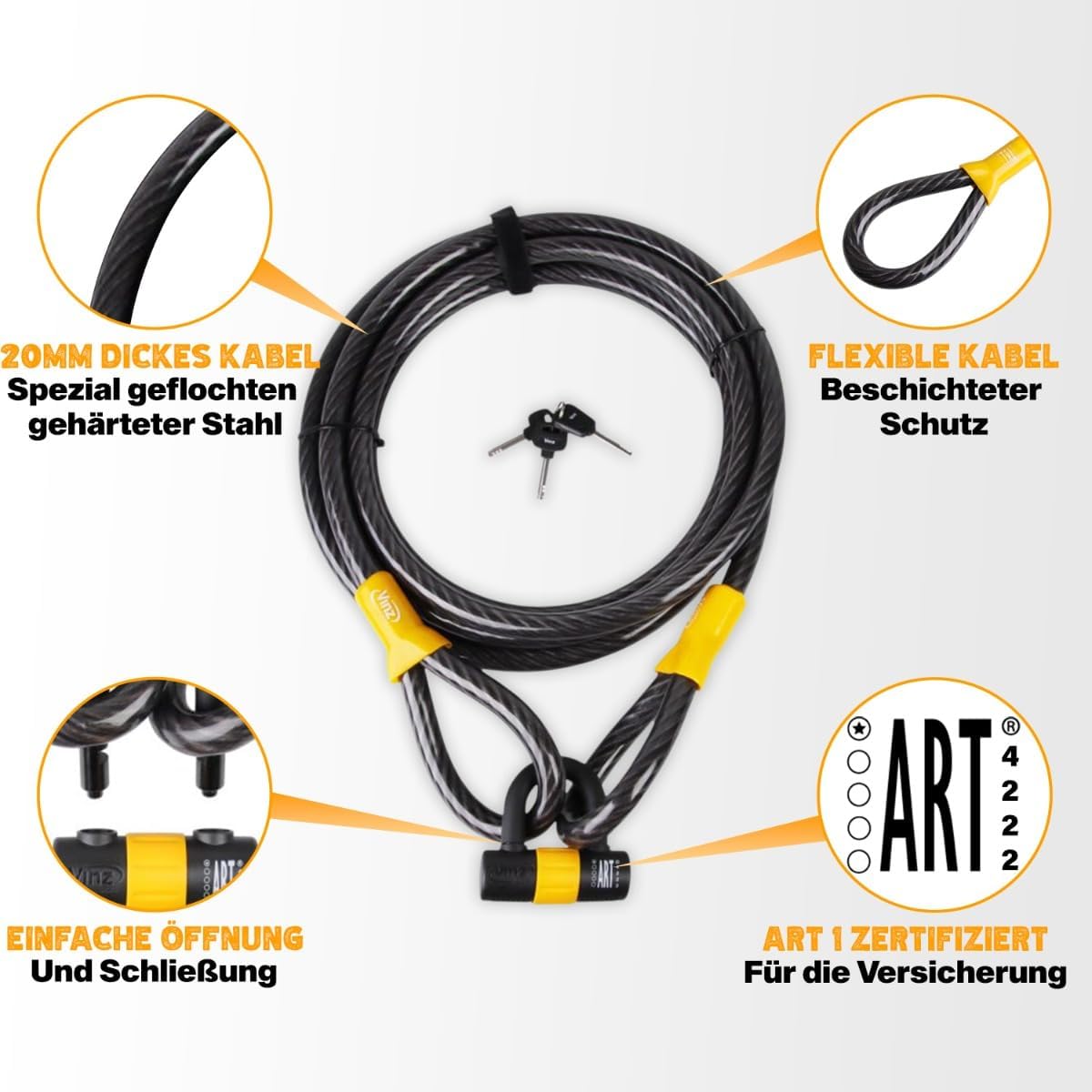 - QUALITÄTSZEICHEN - Das Kabelschloss hat ein ART 1 Gütezeichen und wird daher von den meisten Fahrradversicherungsgesellschaften und bootsversicherungsgesellschaften empfohlen. Stiftung ART hat dieses Kabelschloss unabhängig geprüft und bewertet. Dies