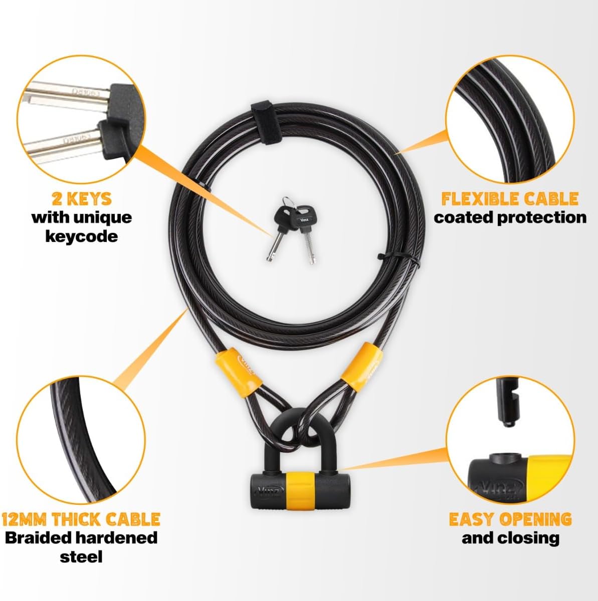 - GRÖSSE - Dieses Kabelschloss ist erhältlich in: 300 cm, 500 cm oder 1000 cm. Das Kabel ist 12 mm dick und die Dicke des Vorhängeschlossbügels beträgt 14 mm. Mit einem Gewicht von bzw. 1,3 kg, 1,7 kg oder 2,7 kg lässt sich schliessen, dass dieses