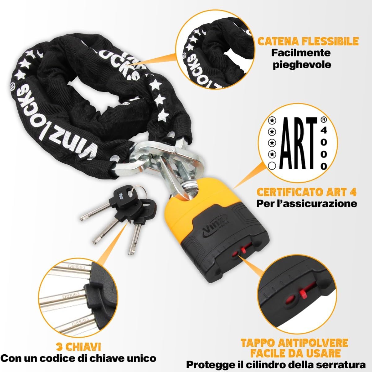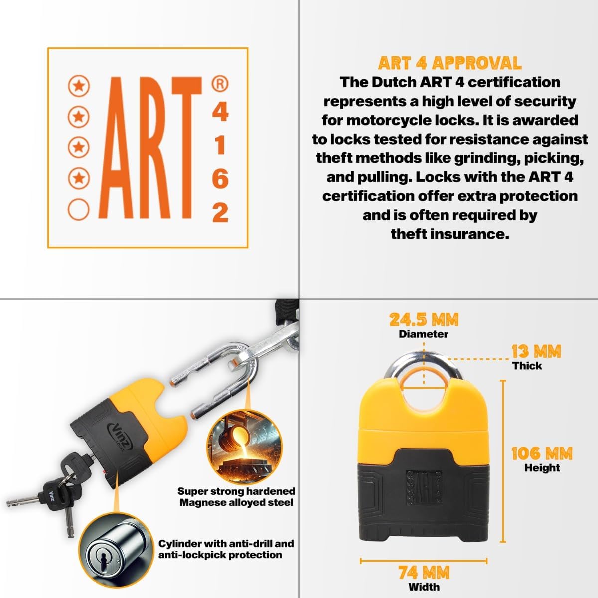 - QUALITÄTSZEICHEN - Das Kettenschloss hat ein ART 4 Gütezeichen und wird daher von den meisten Fahrrad-, Roller- und Motorradversicherungsgesellschaften empfohlen. Die ART Foundation hat dieses Schloss unabhängig geprüft und bewertet. Dies macht