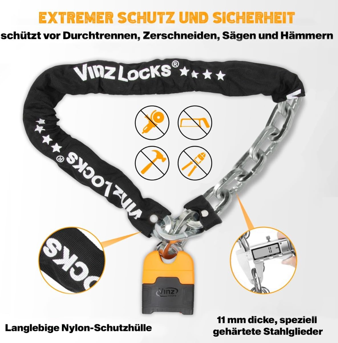 - HOHE QUALITÄT - Diese VINZ Makalu Kettenschloss sind aus extra dickem Stahl und einer Zinklegierung hergestellt und bietet einen hohen Widerstand beim Schneiden und Sägen. Dieses Schloss ist Wasserdicht, fallschutz und korrosionsschutz. Das bedeutet,