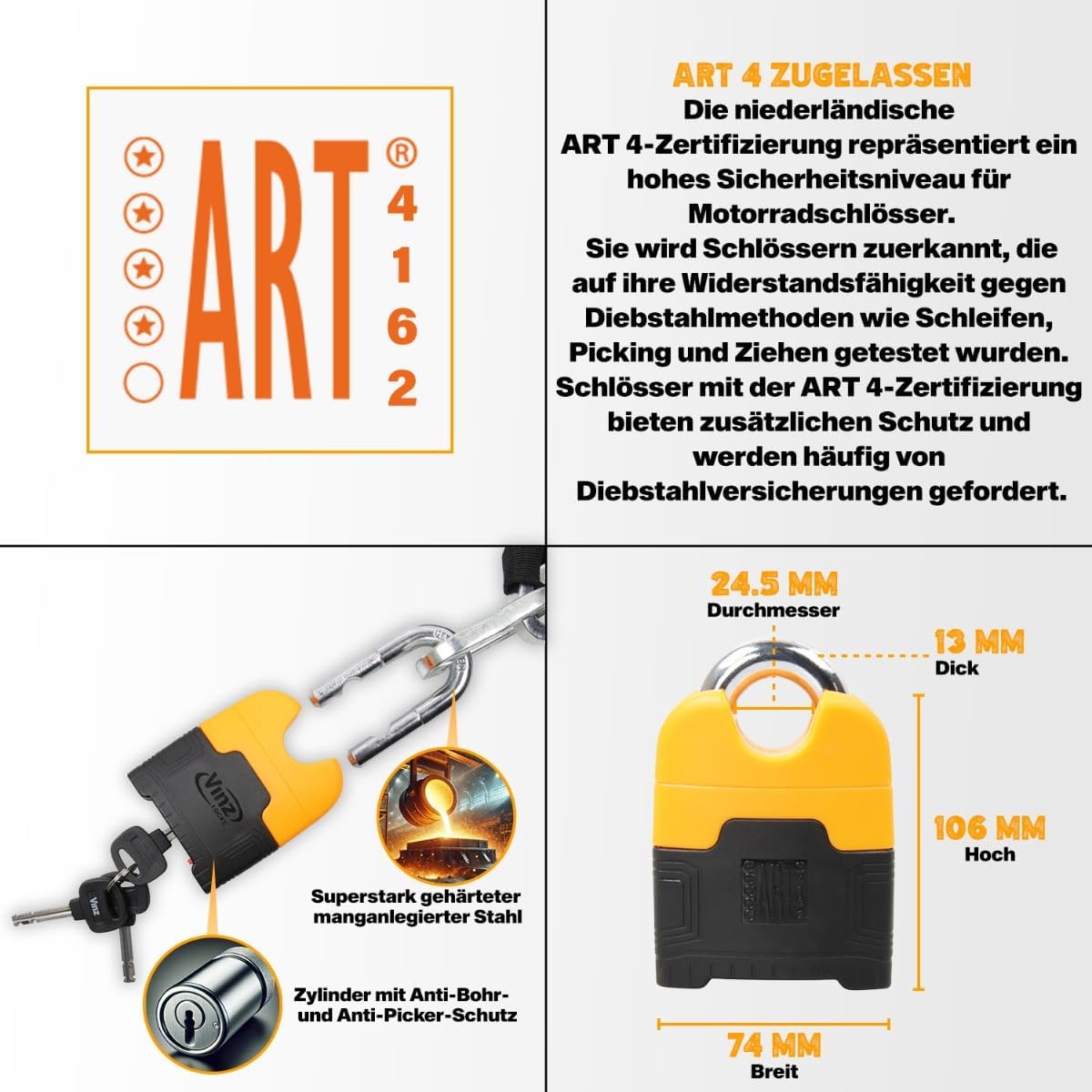 - QUALITÄTSZEICHEN - Das Kettenschloss hat ein ART 4 Gütezeichen und wird daher von den meisten Fahrrad-, Roller- und Motorradversicherungsgesellschaften empfohlen. Die ART Foundation hat dieses Schloss unabhängig geprüft und bewertet. Dies macht