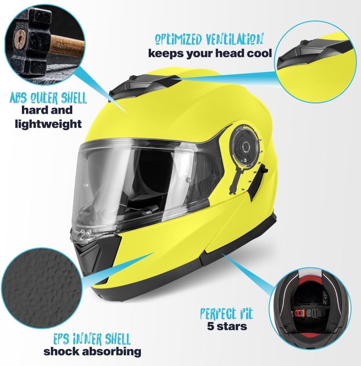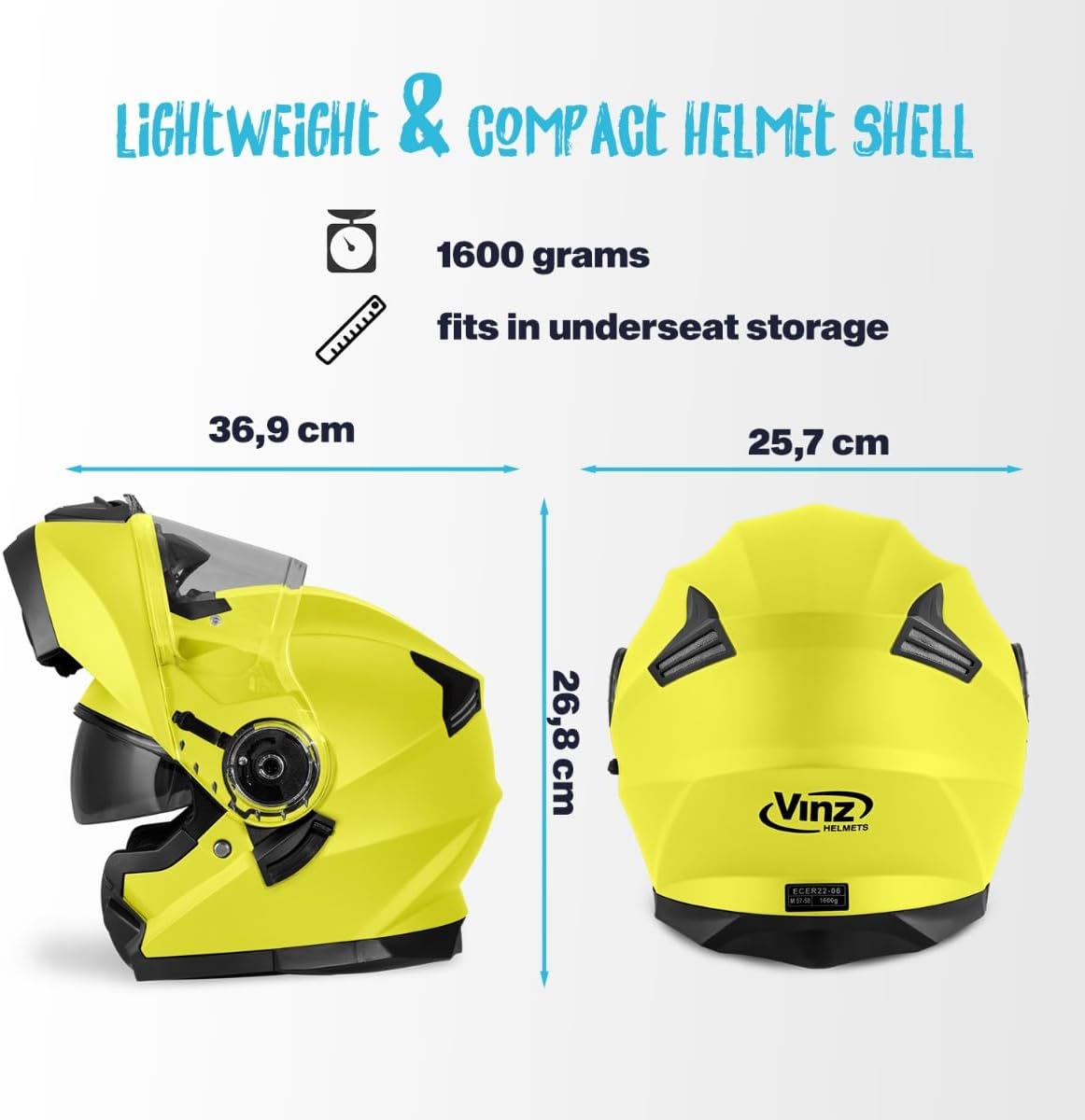 - Hochsicherer Systemhelm nach ECE 22.06 Standards: Der VINZ Santos Helm erfüllt die höchsten Sicherheitsstandards und bietet Schutz mit einer robusten ABS-Aussenschale und einer stossabsorbierenden EPS-Innenschale.