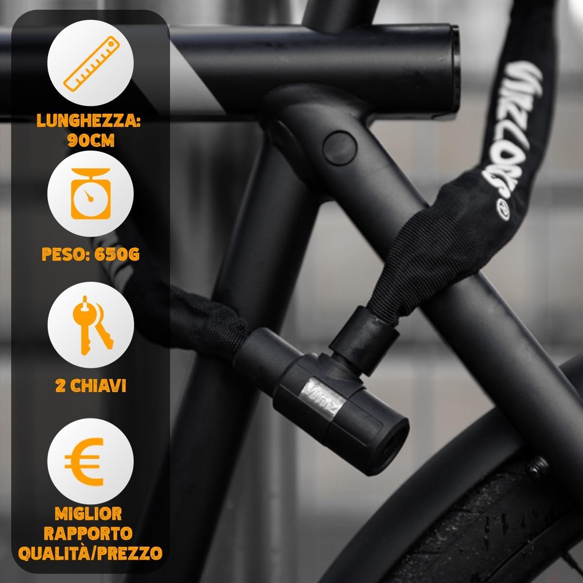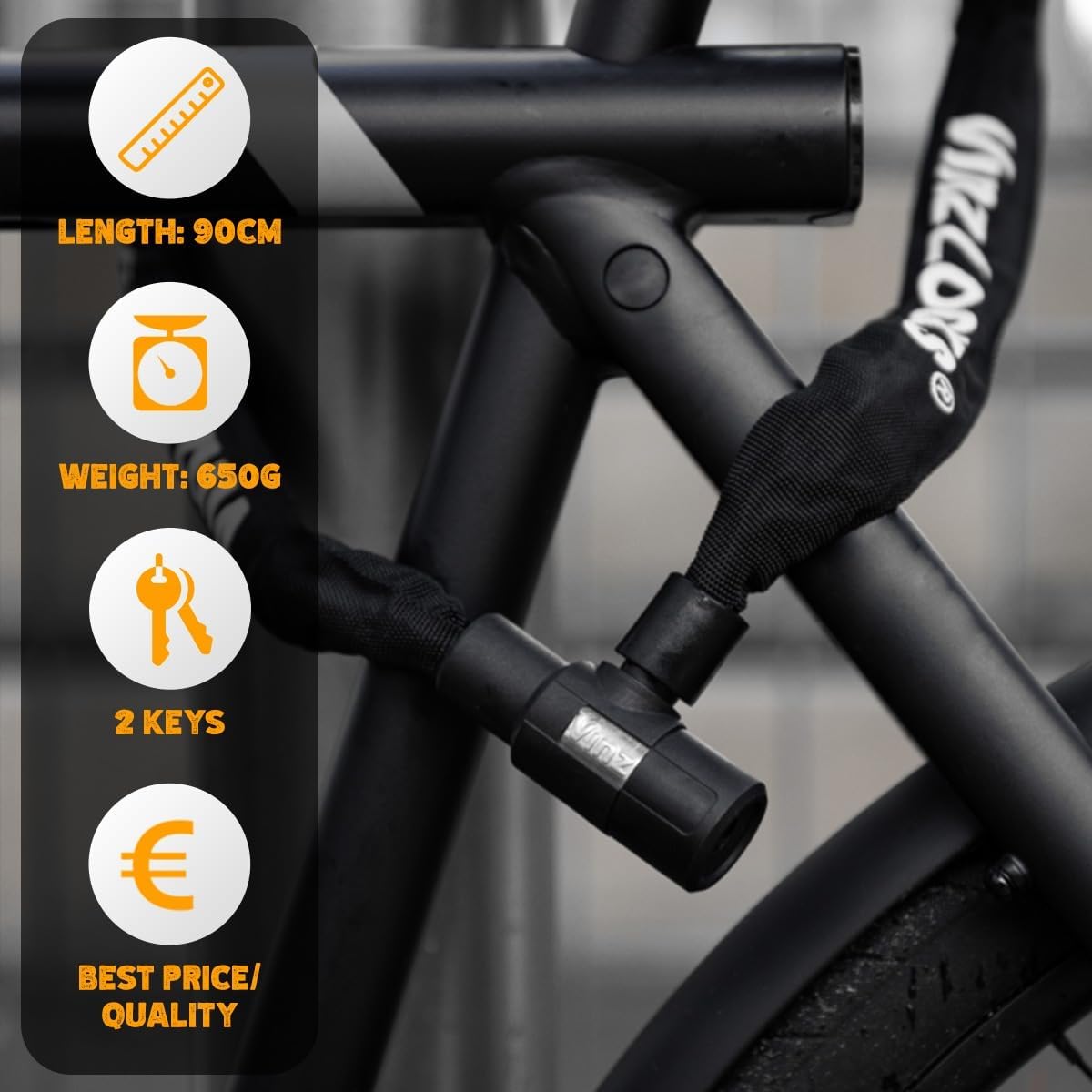 - SICHERES PARKEN - Das Kettenschloss von 90 cm ist ideal, um Fahrräder, Roller, E-Bike, Mountainbikes oder andere Transportmittel zu parken, ohne sich Sorgen machen zu müssen, dass sie gestohlen werden. Auch bei Hoch Temperatur bleibt das Kettenschloss