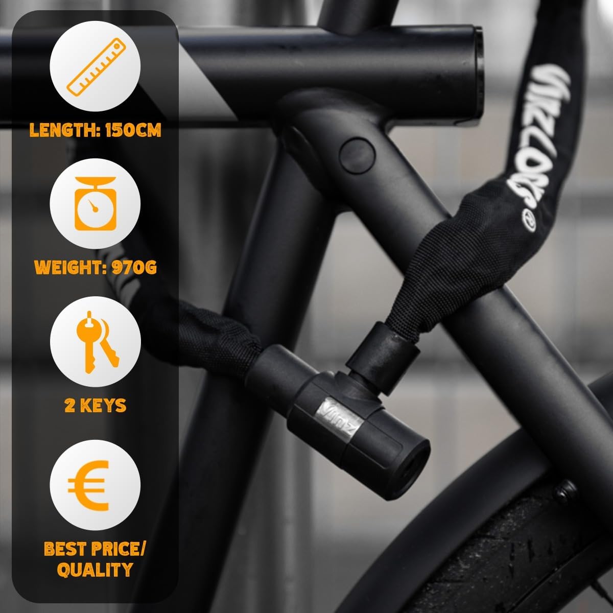 - SICHERES PARKEN - Das Kettenschloss von 150 cm ist ideal, um Fahrräder, Roller, E-Bike, Mountainbikes oder andere Transportmittel zu parken, ohne sich Sorgen machen zu müssen, dass sie gestohlen werden. Auch bei Hoch Temperatur bleibt das Kettenschloss