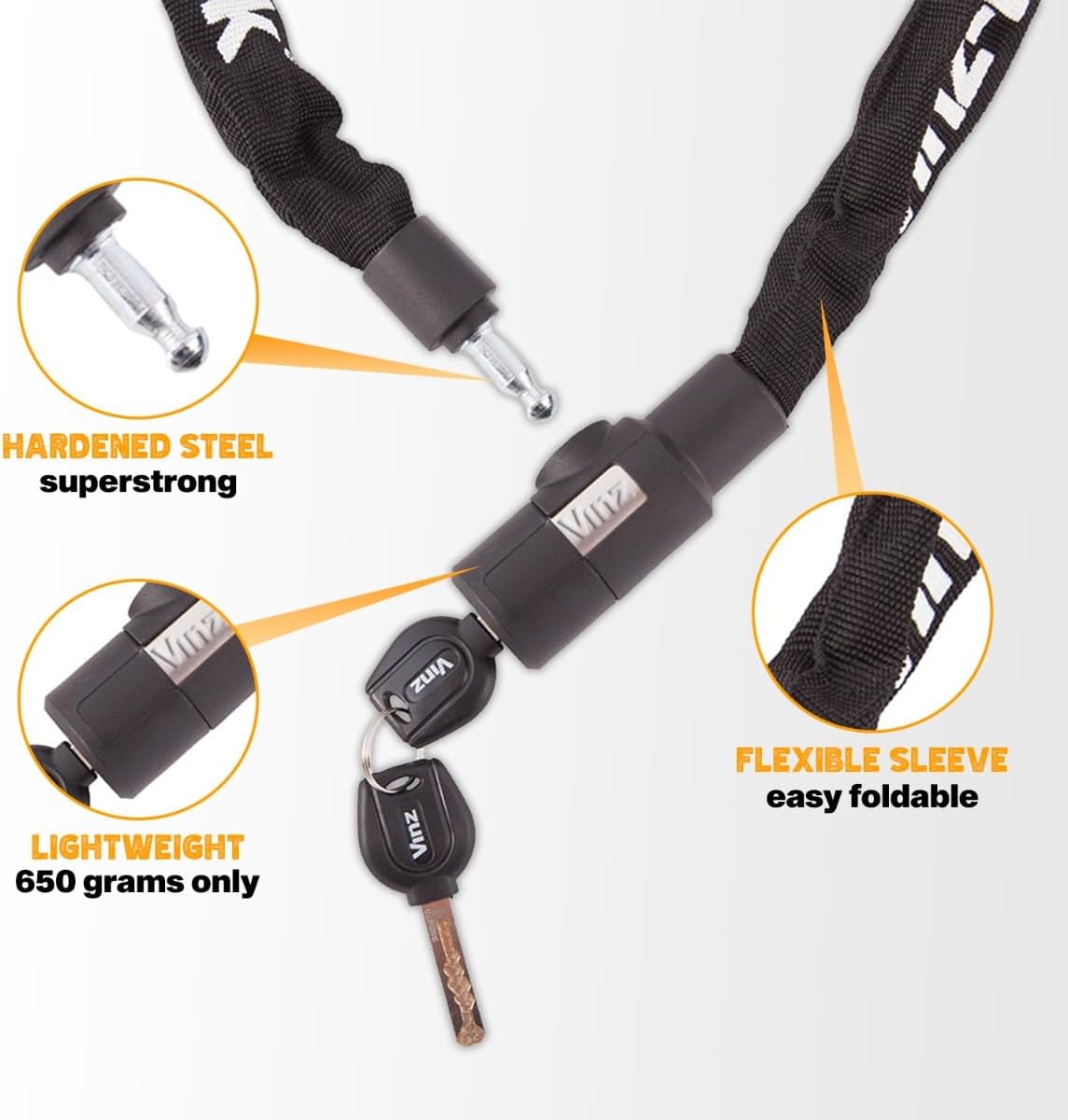 - ZUSÄTZLICHER SCHUTZ - Dieses Schloss hat einen Nylonschutz um die Kette herum, um die lackierten Teile des Motorrads, Rollers oder Fahrrads zu schützen. Darüber hinaus ist das Gehäuse vollständig geschlossen und daher gut gegen Schmutz und Korrosion