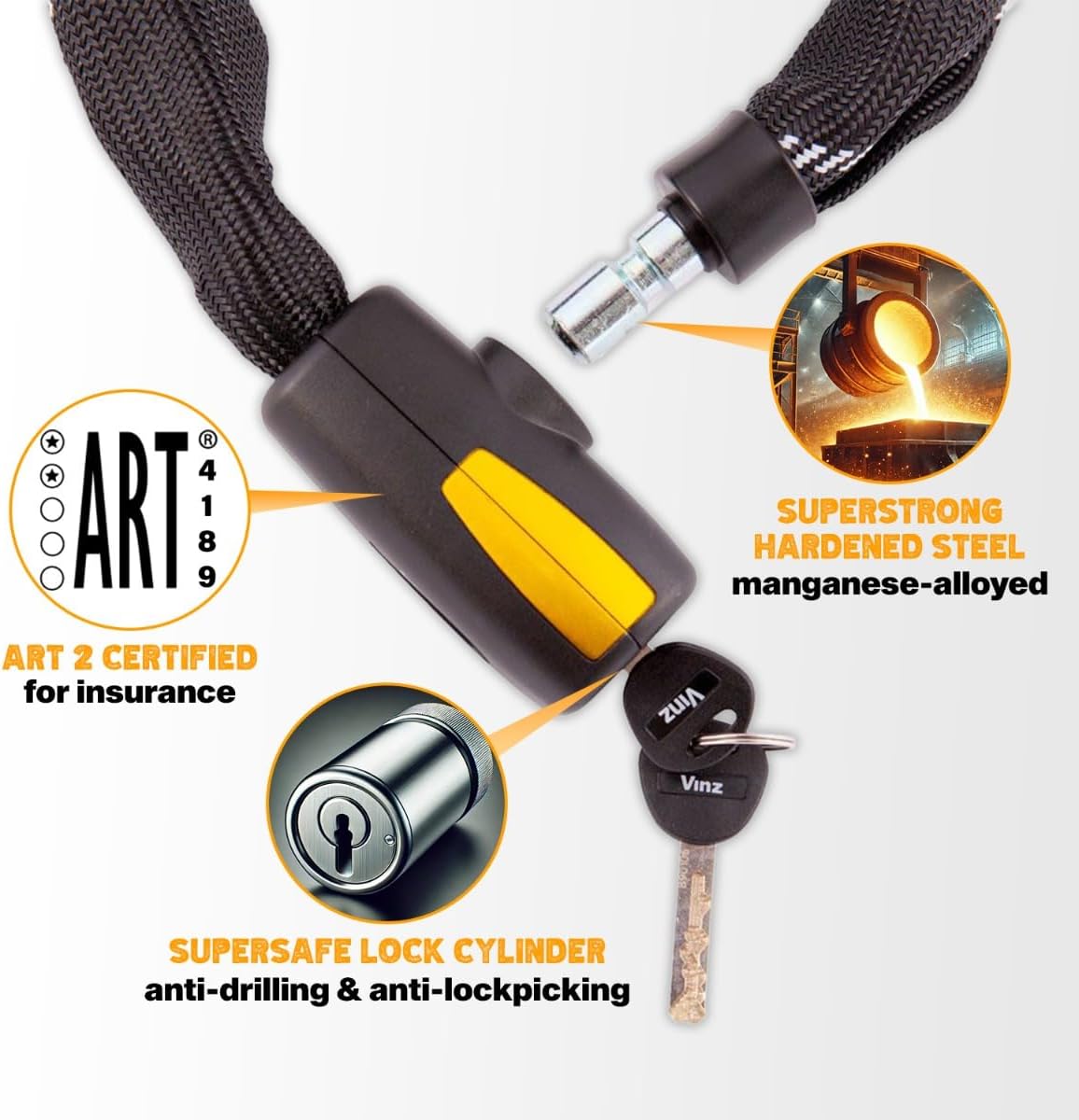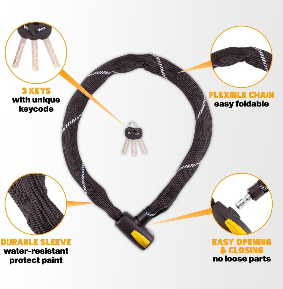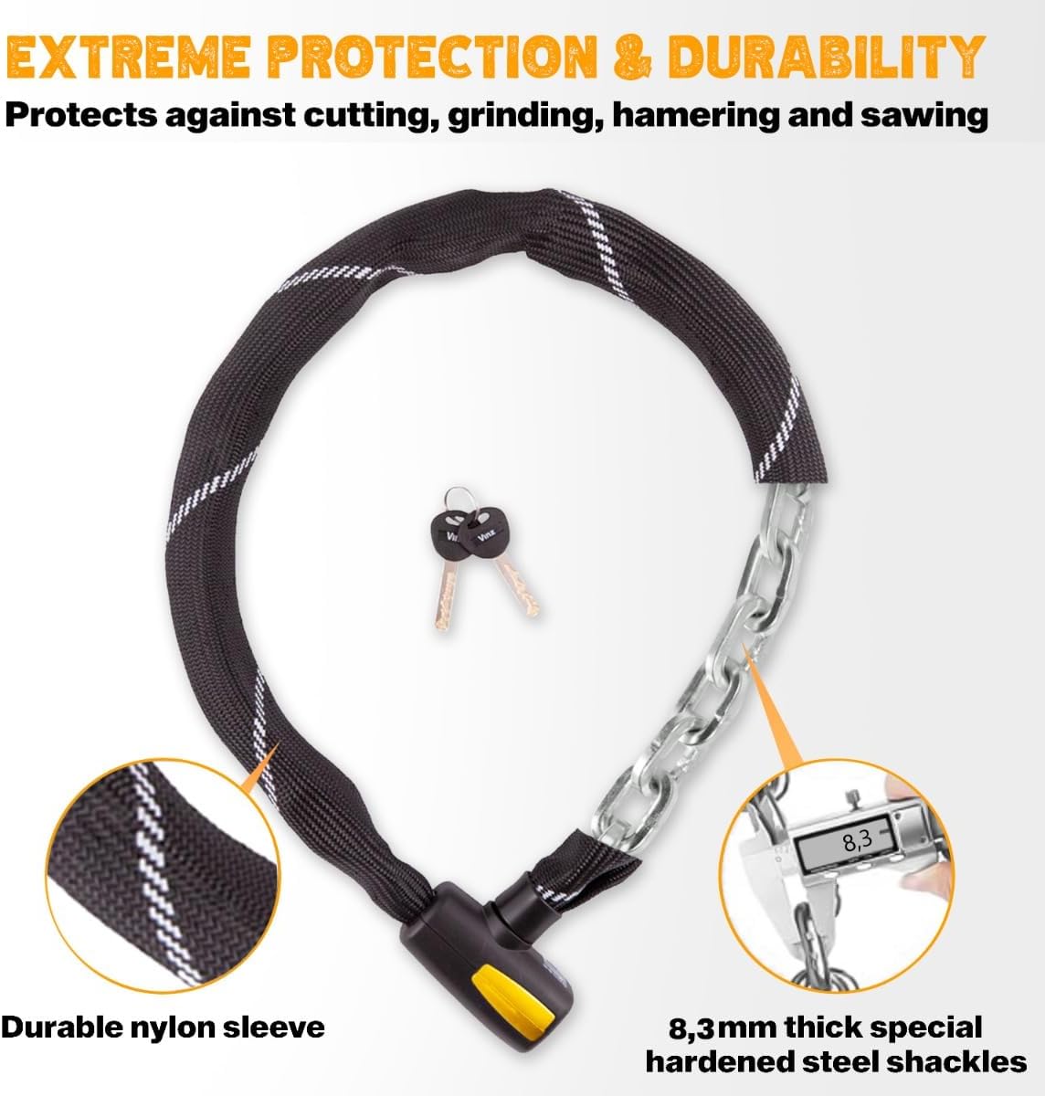 - KRATZFESTER SCHUTZ - Die Kette des Fahrradschlosses ist zum zusätzlichen Schutz der Ausrüstung mit einem staub- und reissfesten Nylongewebe umwickelt, um die Kette und Ihr Fahrrad vor Kratzern zu schützen.Machen Sie sich nie wieder Gedanken darüber,