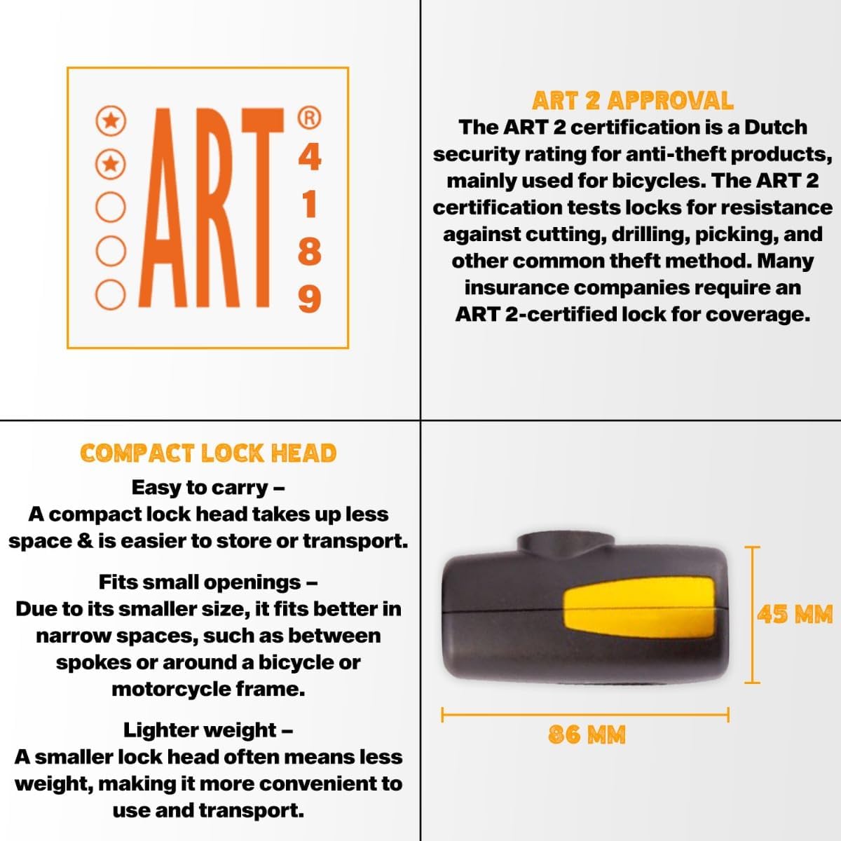 - QUALITÄTSZEICHEN - Dieses Fahrradschloss hat ein ART 2 Gütezeichen und wird daher von den meisten Fahrradversicherungsgesellschaften empfohlen. Die ART Foundation hat dieses Schloss unabhängig geprüft und bewertet. Dies macht dieses Schloss zu einer