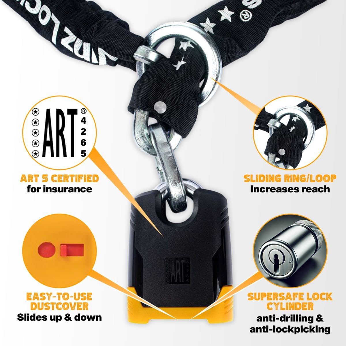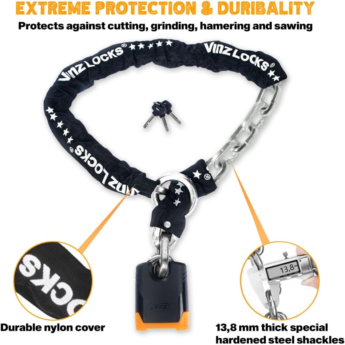 - SCRATCH WIDERSTANDSFÄHIG PROTECTION - Die Kette des Motorrradschloss ist zum zusätzlichen Schutz der Ausrüstung mit einem staub- und reissfesten Nylongewebe umwickelt, um die Kette und Ihr Motorrad vor Kratzern zu schützen. Machen Sie sich nie wieder