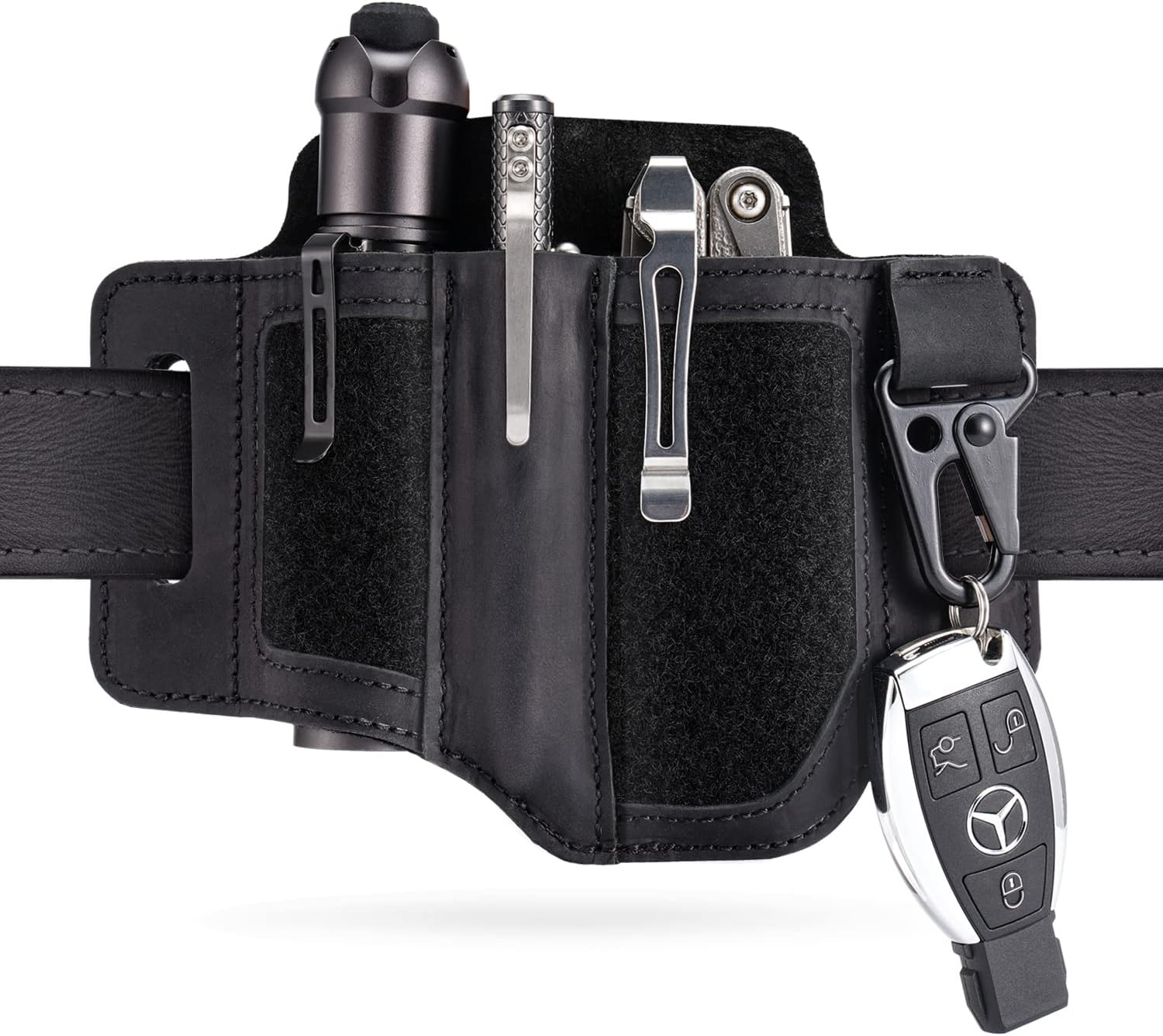- 【EDC Lederscheide Organizer mit Schlüsselhalter】Multitool scheide für gürtel verfügt über 2 grosse Taschen für Taschenlampe/ Klappmesser/ Multitools, 1 kleine Tasche für Stifte und 1 Schlüsselbundhaken. Leder pocket organizer für Gürtel ist