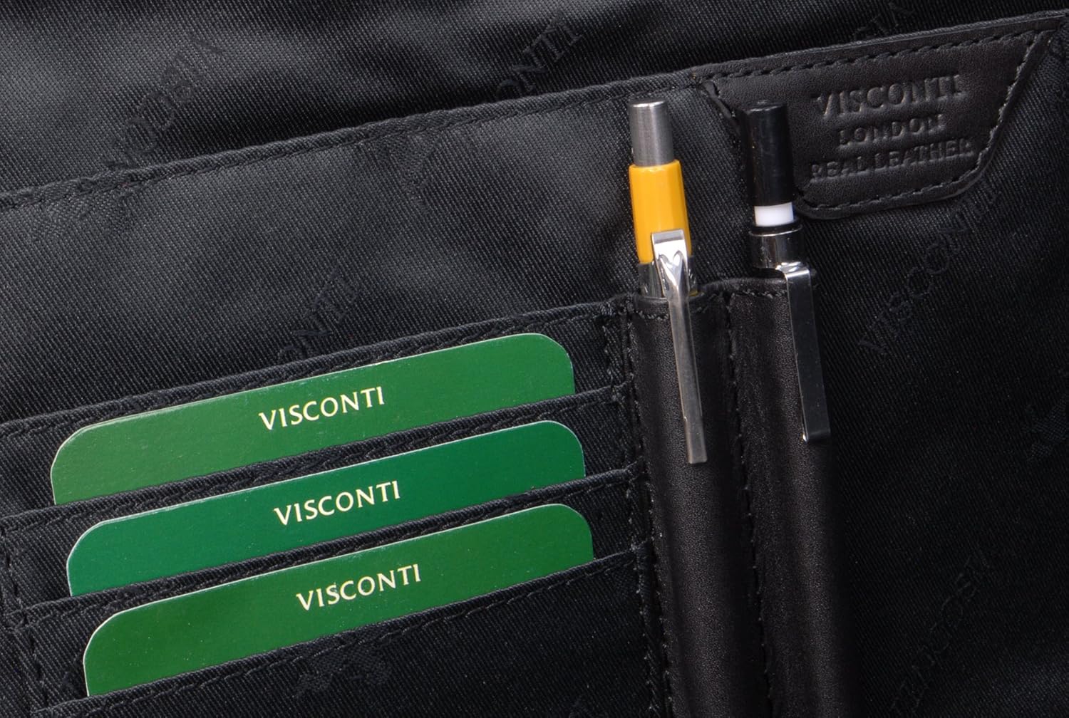 • FÄCHER: 1 Hauptfach + 1 grosses Innenfach + 1 Visitenkartenetui + 2 Stifthalter + 1 aussenliegendes Reissverschlussfach an der Vorderseite.