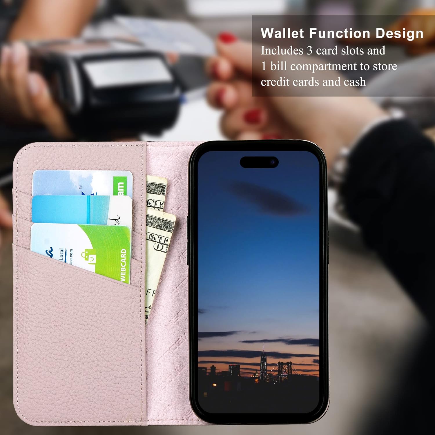 - 【Weiche TPU-Innenschale und Brieftaschendesign】: Gepolsterte Stossstange in vier Ecken, um sicherzustellen, dass Ihr Gerät sicher in der stossfesten TPU-Innenschale befestigt ist, um alle Stürze und Stösse zu verhindern. iPhone 13 Pro Klapphüllen