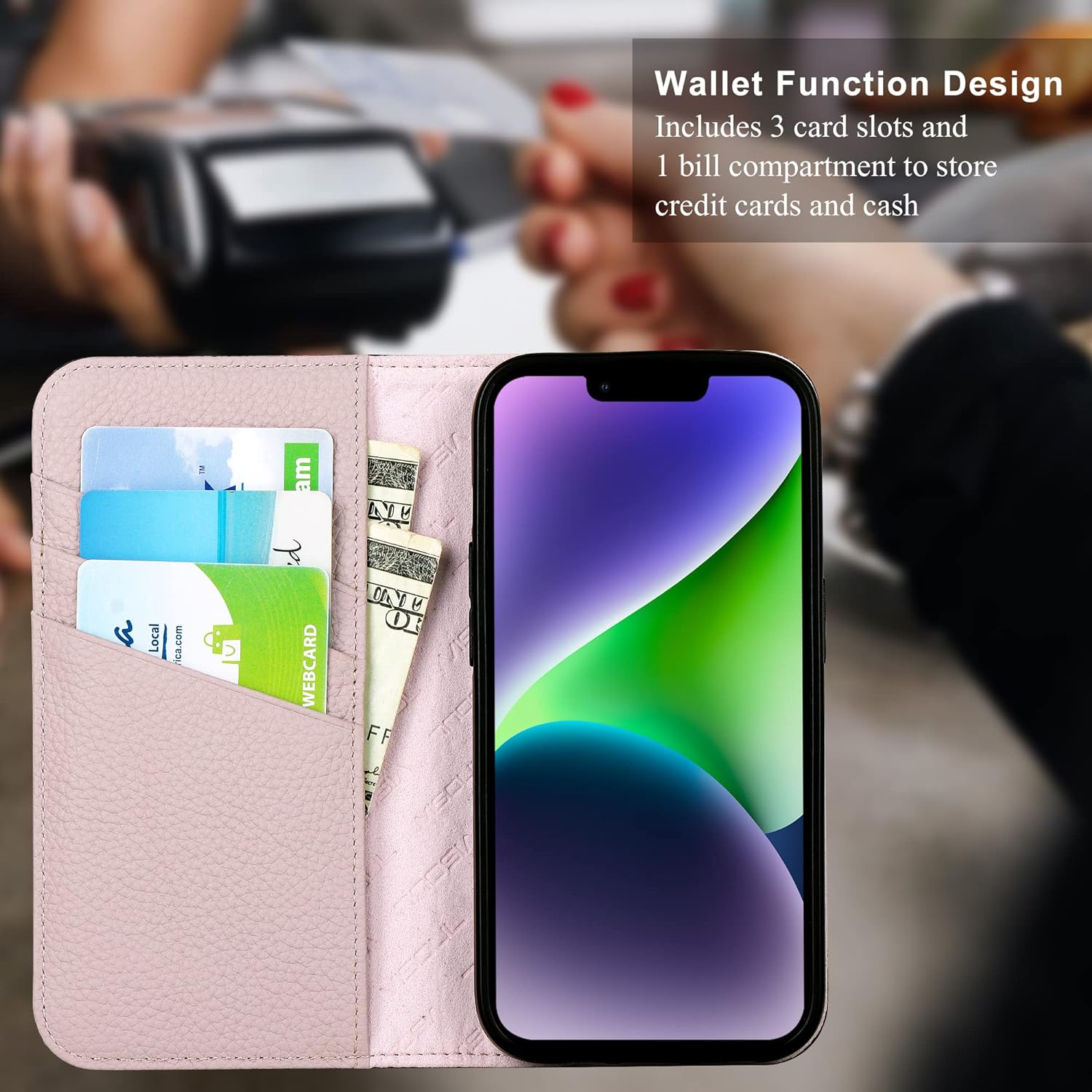 - 【Weiche TPU-Innenschale und Brieftaschendesign】: Gepolsterte Stossstange in vier Ecken, um sicherzustellen, dass Ihr Gerät sicher in der stossfesten TPU-Innenschale befestigt ist, um alle Stürze und Stösse zu verhindern. iPhone 13 Klapphüllen