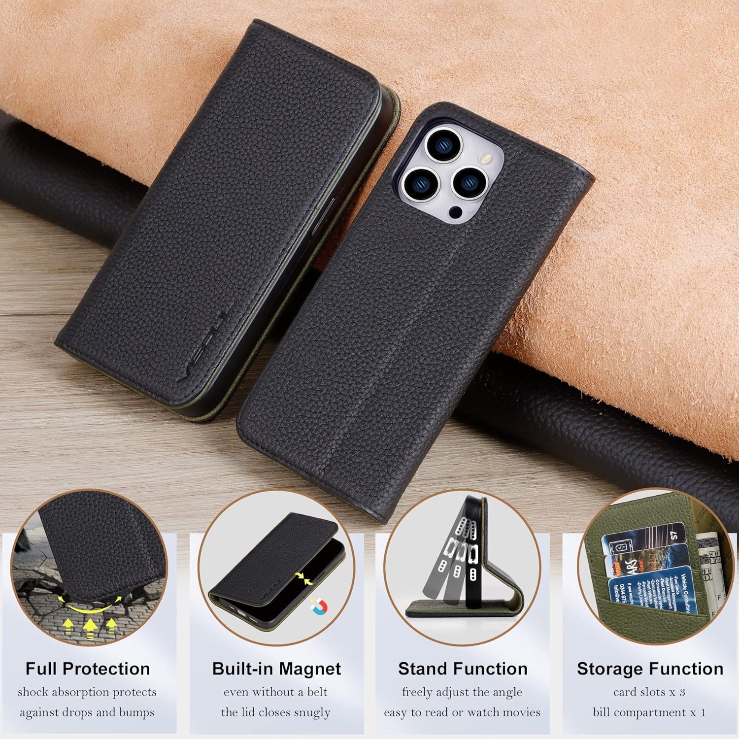 - 【100% ECHTES LEDER】: iPhone 14 Pro Lederhüllen aus hochwertigem Rindsleder, sind langlebig, atmungsaktiv und weich. Das Leder behält die Festigkeit der Fasern und die natürliche Textur der Oberfläche, wodurch jede Handyhülle einzigartig ist.