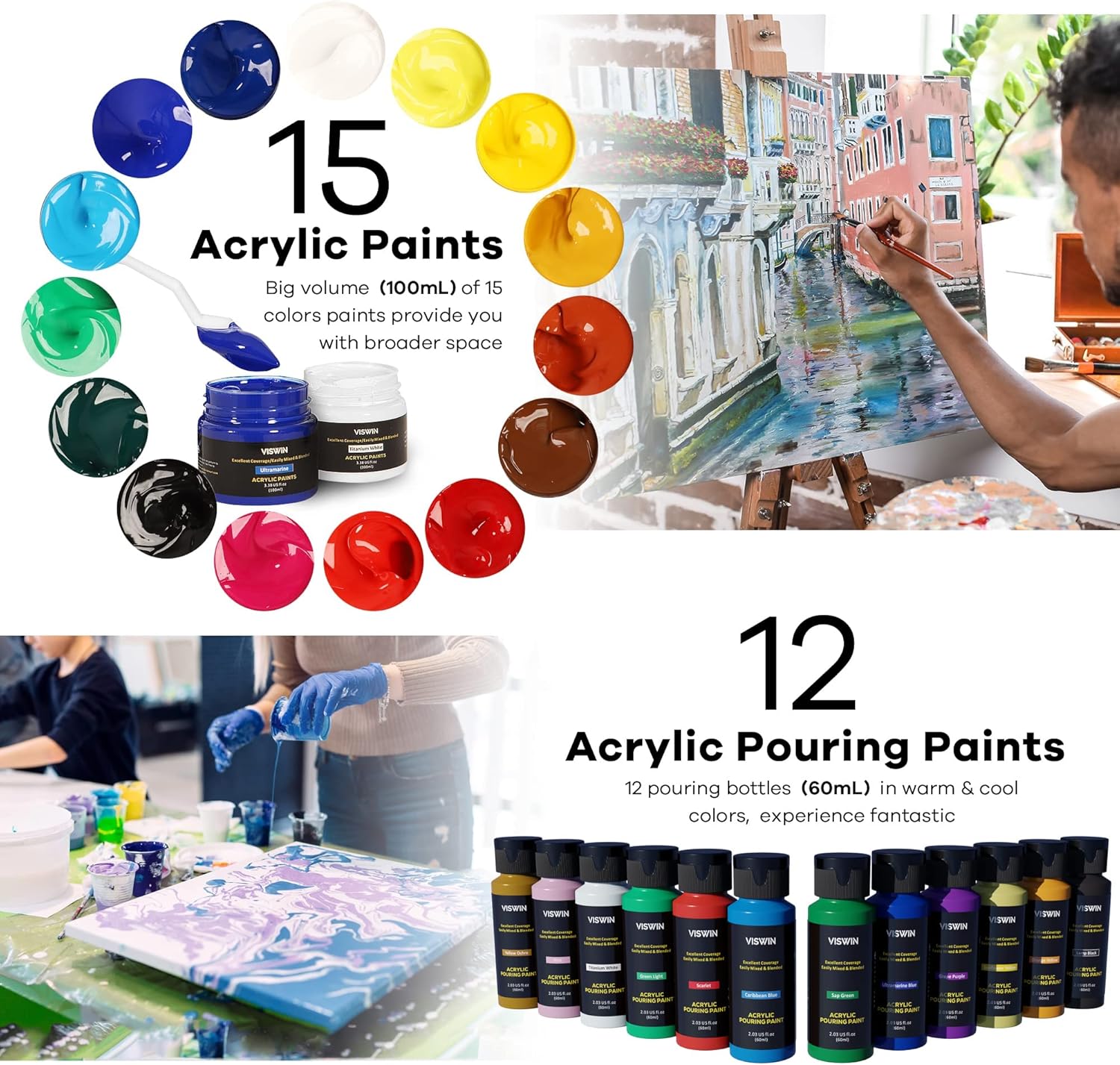 - [Erstaunliche Giesskunst] Dieses wunderschöne Acryl-Malset enthält sogar ein Giesskunst-Set für Einsteiger mit 8 Flaschen (120 ml) klassischer lebendiger Farben. Sie müssen keine anderen Medien kaufen und sparen sich die Mühe, sie zu mischen. Machen Sie sich bereit zum Giessen und beginnen Sie jederzeit mit Ihrem kreativen Kunstwerk!