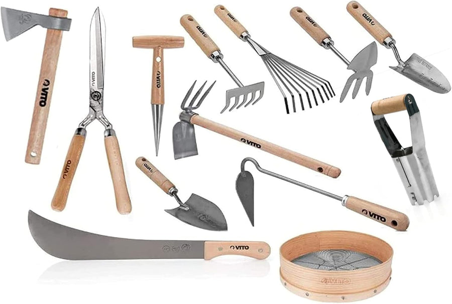 - ✅ 13-teiliges Gartenwerkzeug Set bestehend aus: Axt, Heckenschere, kleine Schaufel, spitze Schaufel, Buschmesser, Herzhäulein, Gartenhäckchen, Kleinrechen, Kleinfächerbesen, 3-Zinken-Doppelhacke, Zwiebelpflanzer, Pflanzlochstecher, Holzrandsieb.