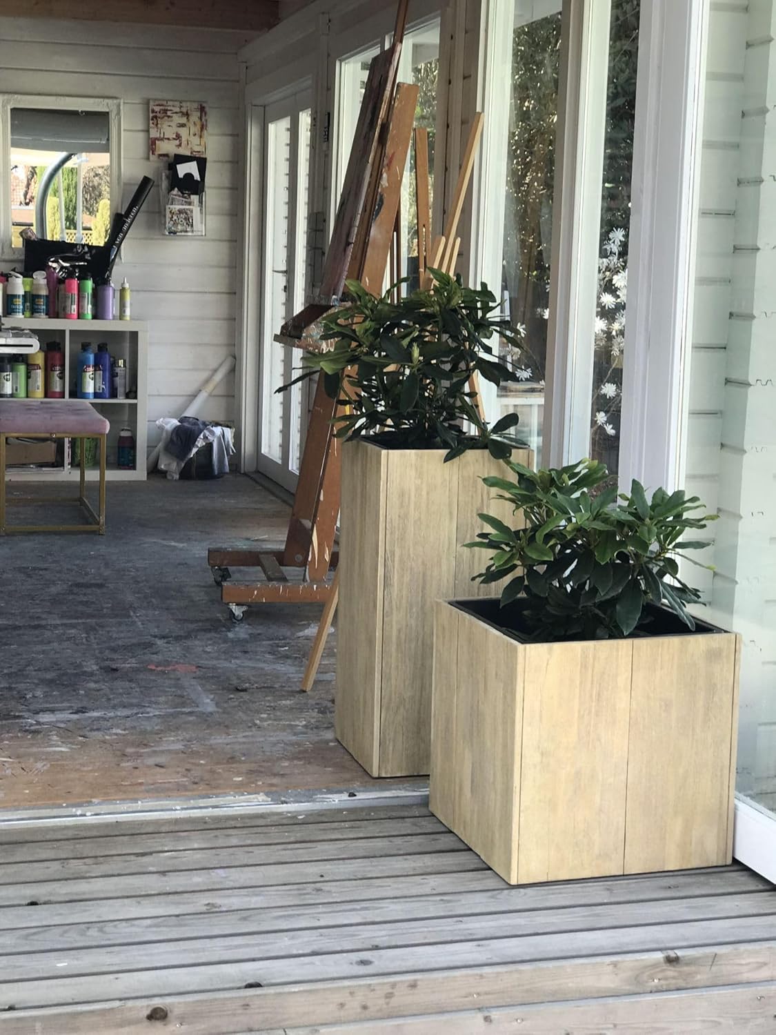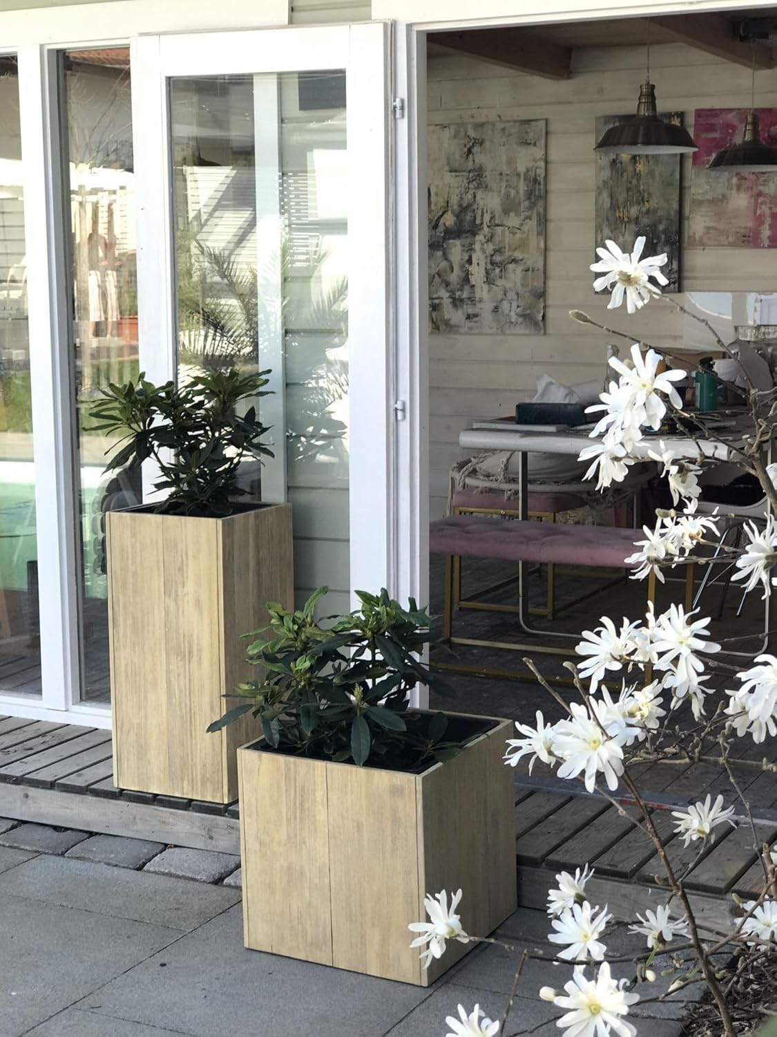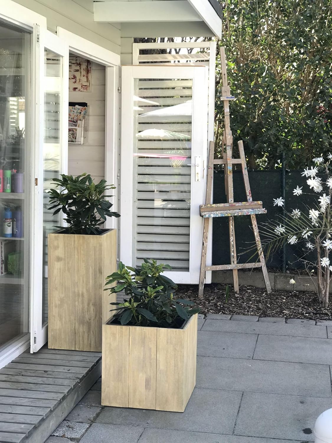 - rechteckiger hoher Pflanzkübel aus Akazienholz in hellem Braunton - optisch ansprechende Oberflächenstruktur der Holzmaserung