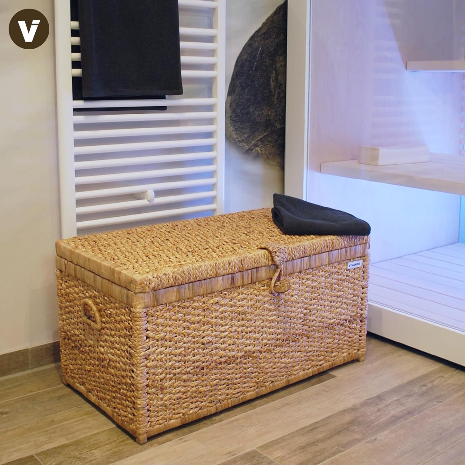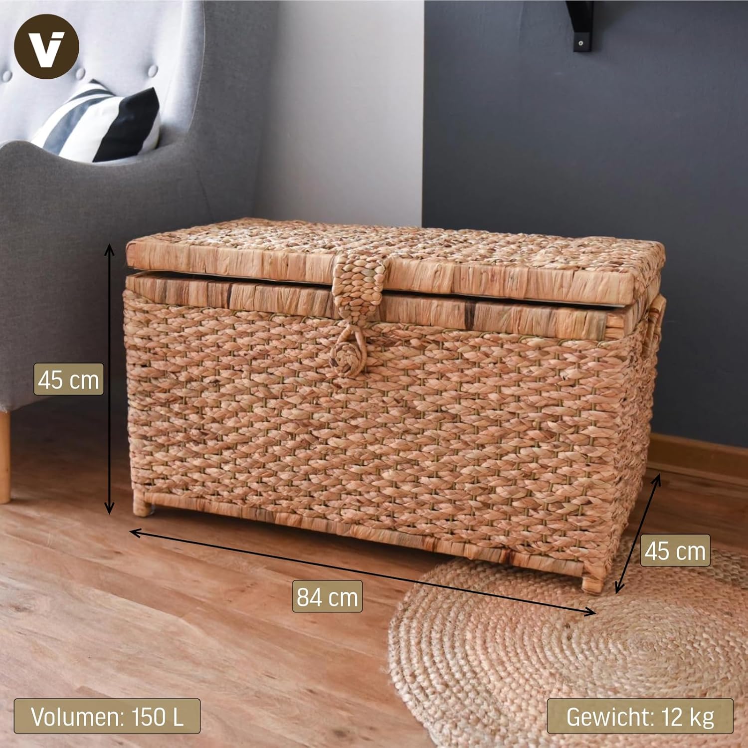 - Natürliche Materialien: Gefertigt aus 100% natürlicher Wasserhyazinthe, gewebt auf einem stabilen Holzrahmen, ist die Truhe langlebig und umweltfreundlich.