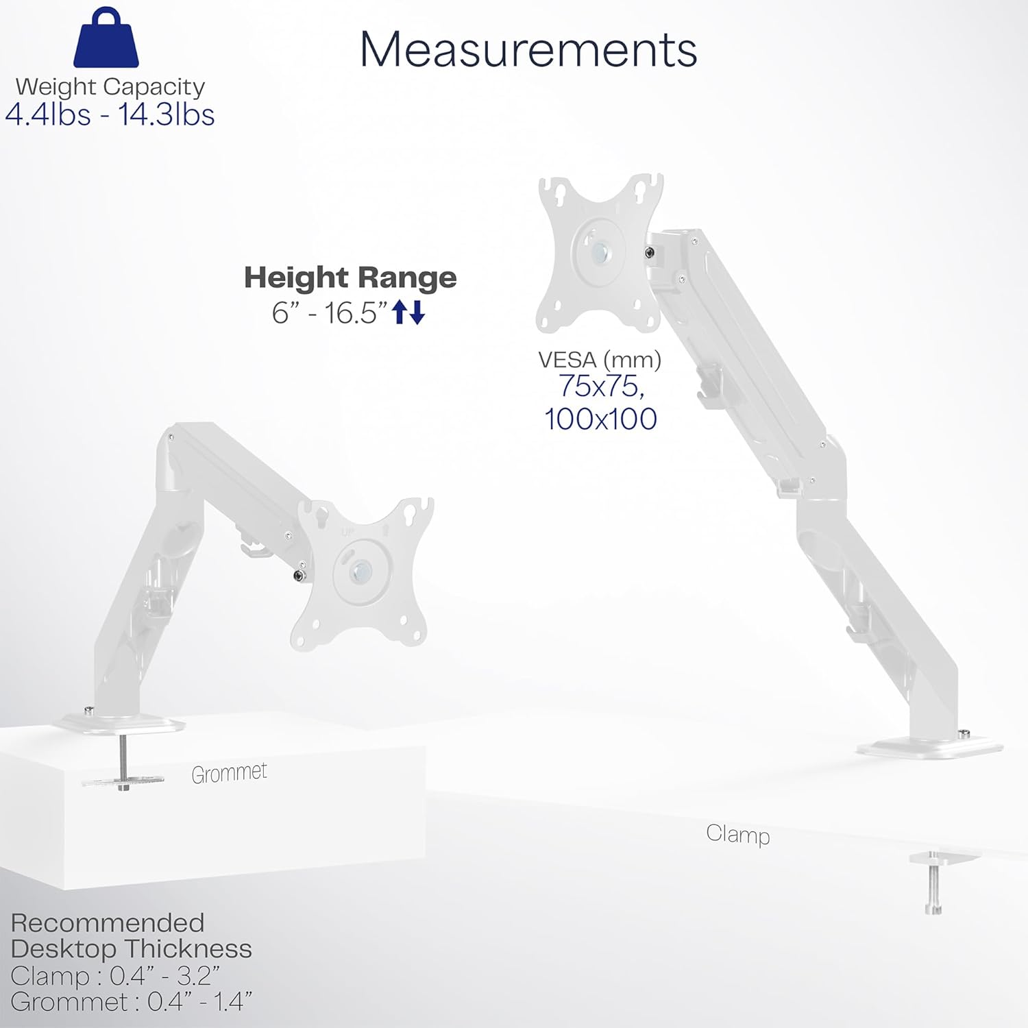• Voll verstellbar – Der leistungsstarke pneumatische Federarm bietet einen Höhenbereich von 15,2 cm bis 41,9 cm, und die Halterung verfügt über eine Neigung von -45 ° bis +90 °, um 180 ° drehbar und um 360 ° drehbar für komfortable