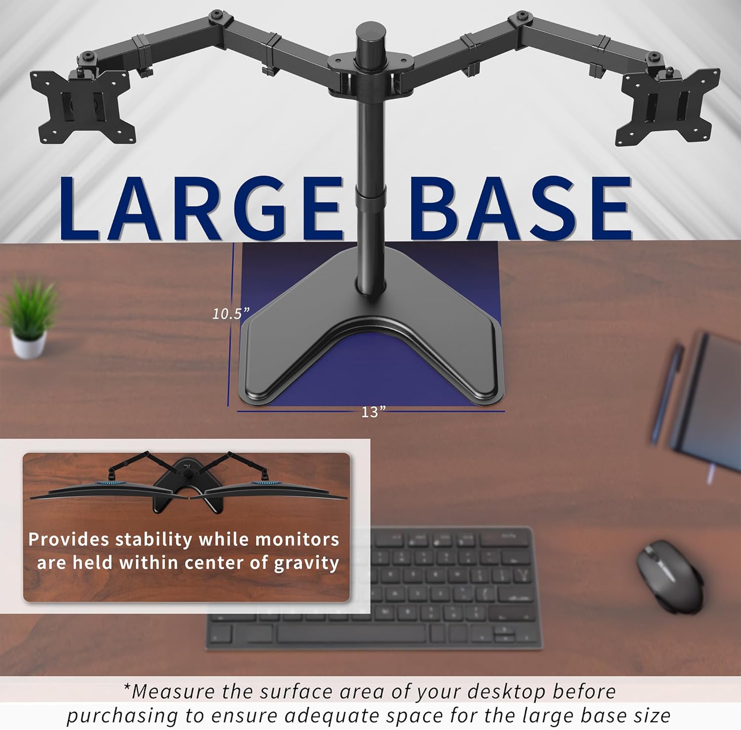 - Strapazierfähige Basis – Misst 13 Zoll x 10,5 Zoll und bietet solide Stabilität, während die Monitore in ihrem Schwerpunkt gehalten werden. Die Unterseite der Basis ist gepolstert, um Ihren Schreibtisch vor Kratzern zu schützen.