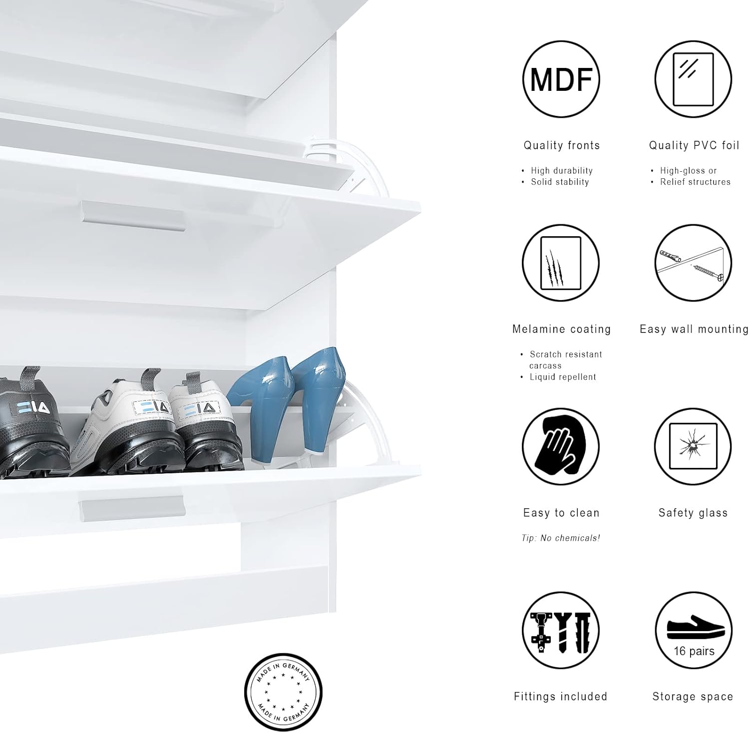 - Material: Dank hochwertig foliierten MDF-Fronten und einem Korpus aus Spanplatten mit Melaminbeschichtung ist der Schuhschrank angenehm leicht, stabil und zudem besonders pflegeleicht. Wertige Verarbeitung - Made in Germany.