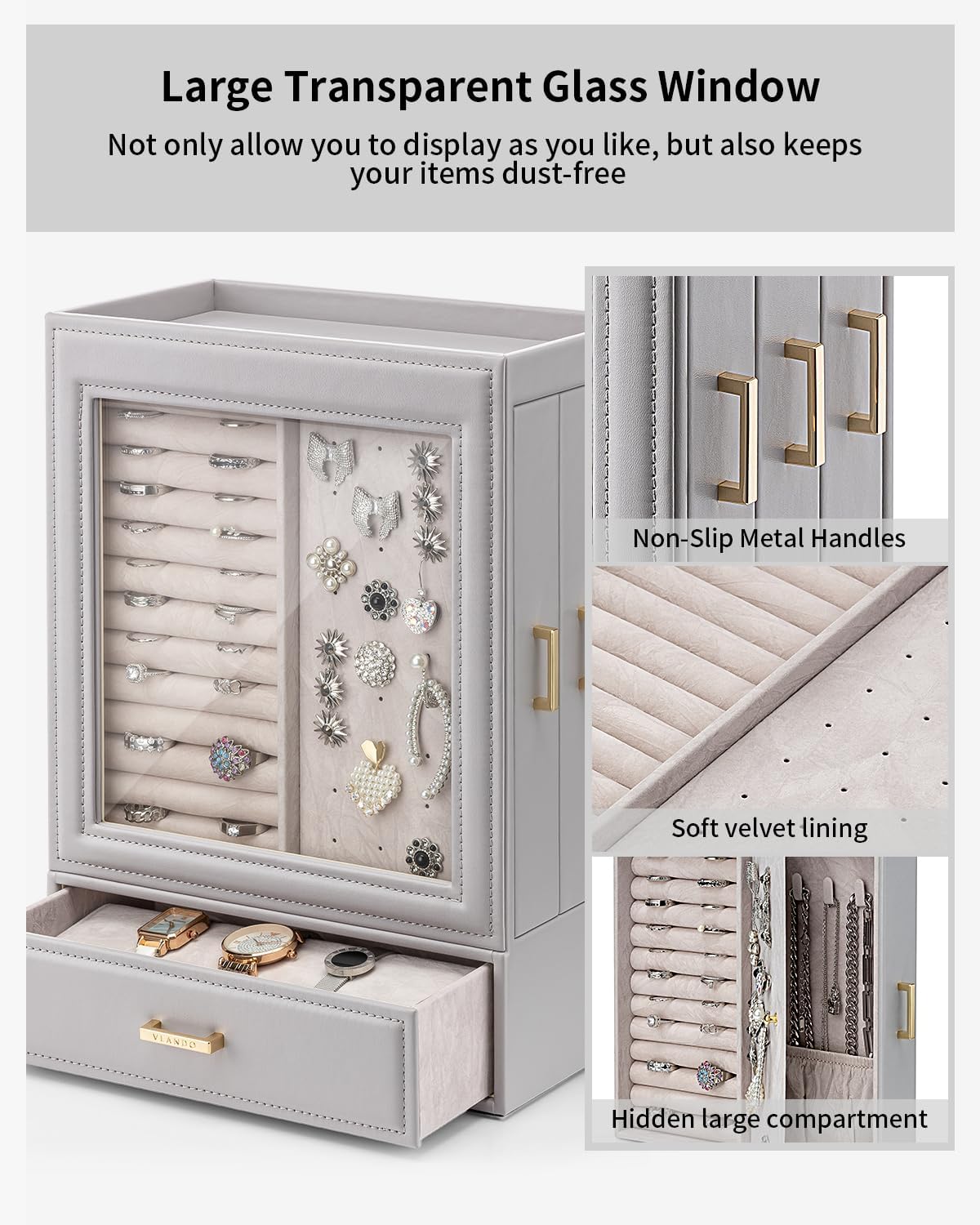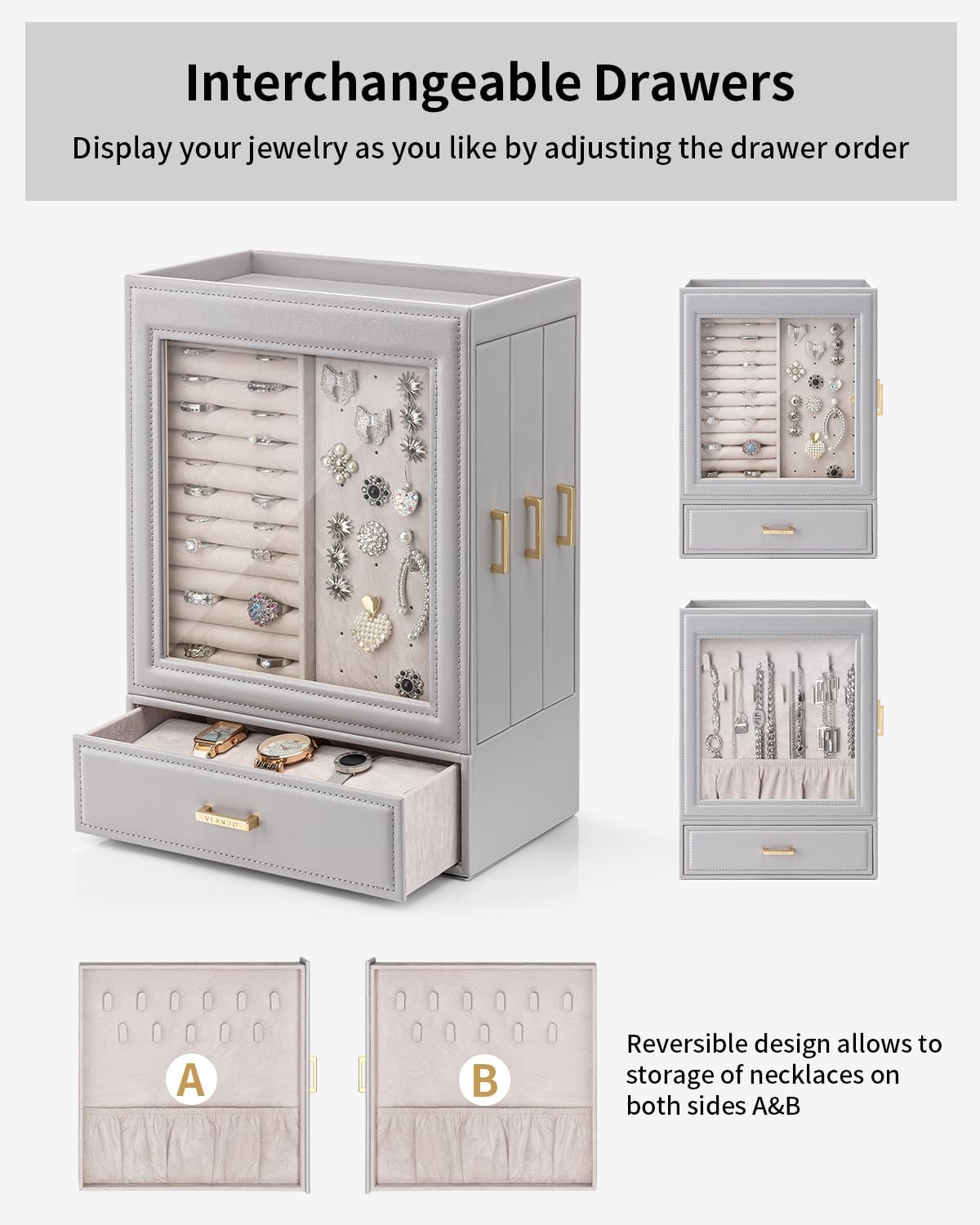 - 【Seitliche Schubladen】 Durch das Design der Seitenschublade können Sie die Position der Schublade frei ändern. Klares Glas erleichtert die Präsentation Ihres schönen Schmucks und schützt ihn vor Staub. Modern Schmuck Organizers