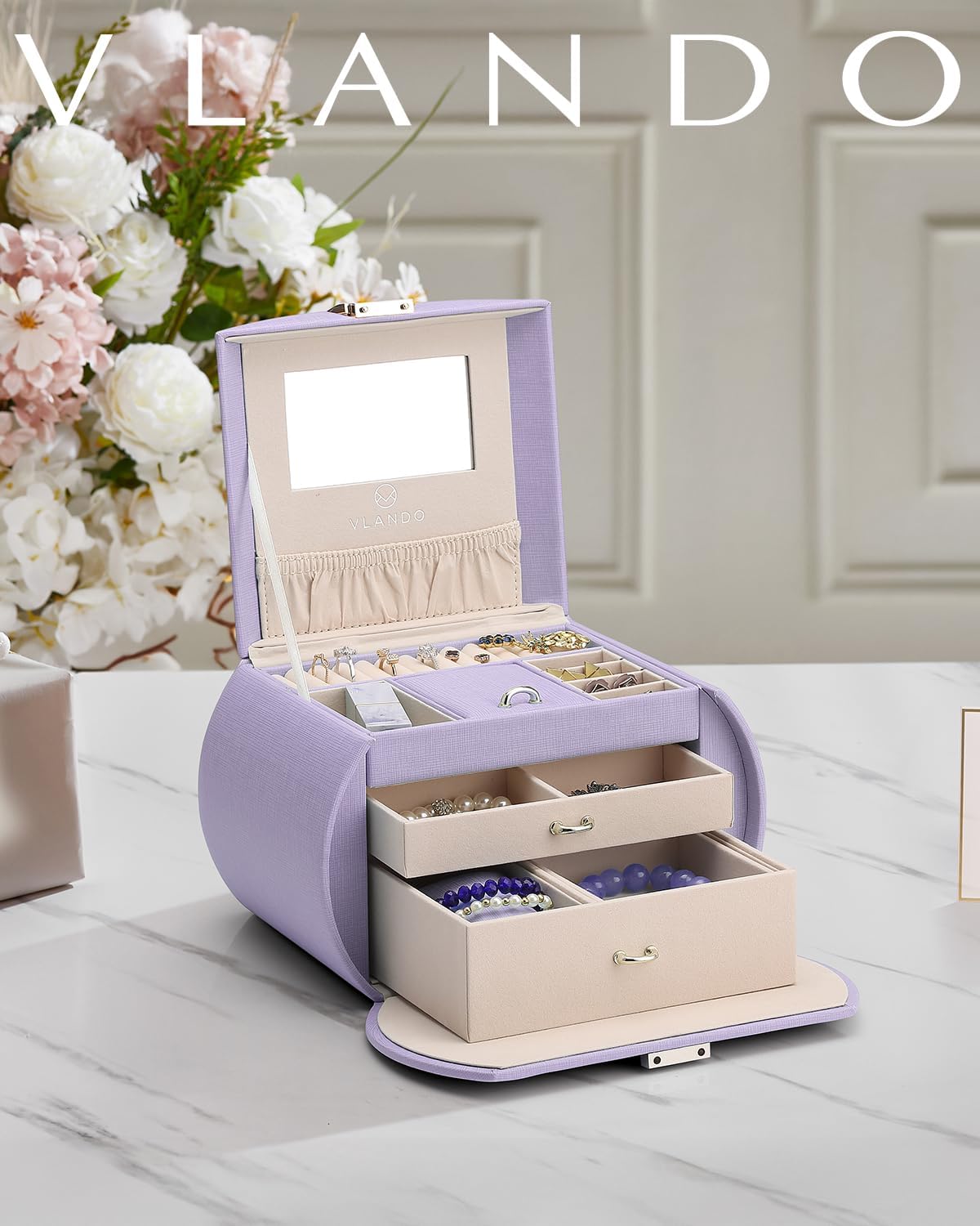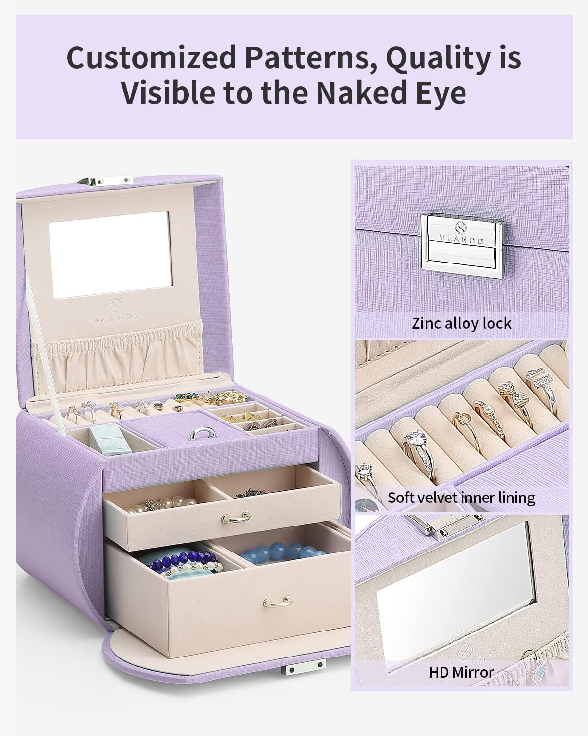 - 1 grosser Spiegel im oberen Deckel, Spiegelgrösse: 9,5 x 5,5 cm, mit einem Vlando Logo unter dem Spiegel. Zur Aufbewahrung jeder Art von Schmuck stehen zwei Ablagen mit angemessener Anleitung (evtl. nicht in deutscher Sprache) bereit.
