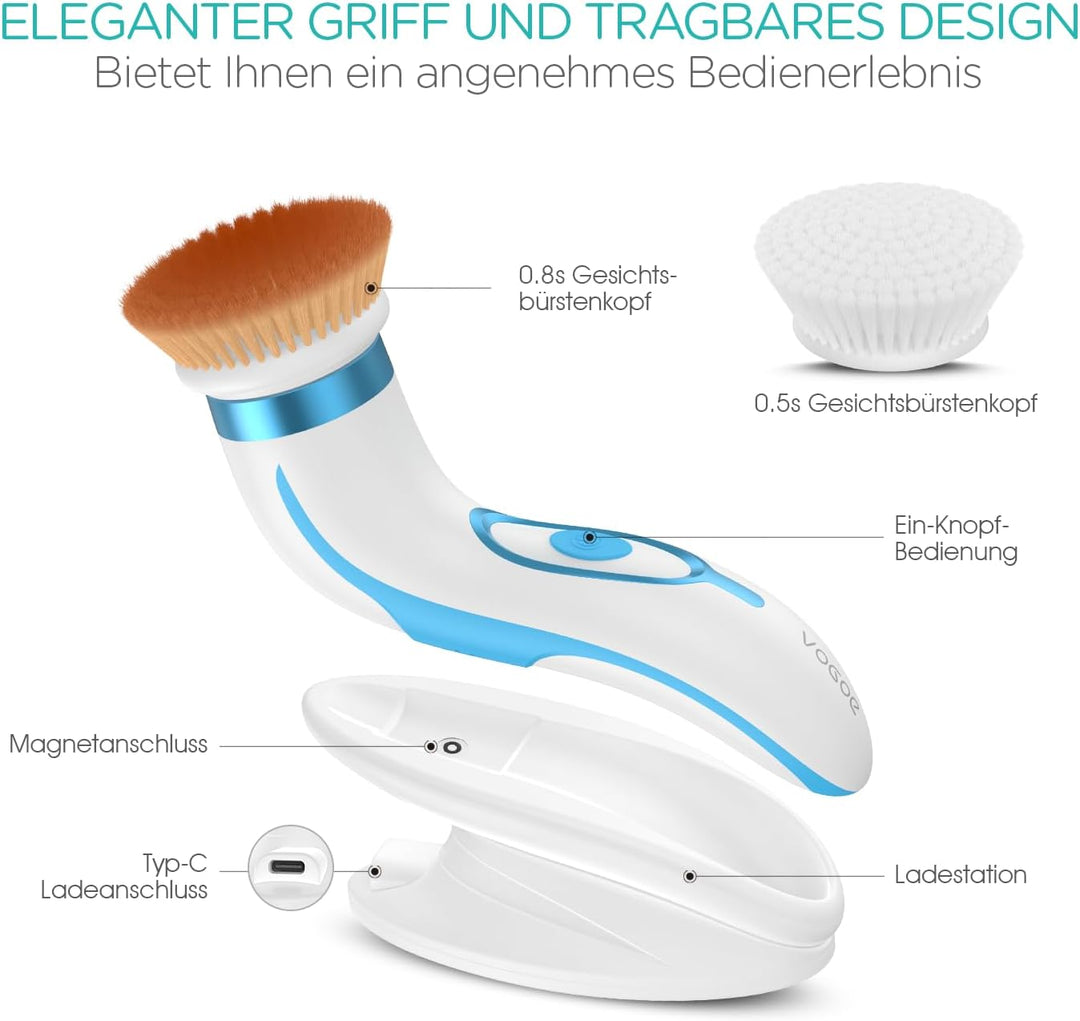 - Sicher und praktisch – Der gesicht bürste mit einer Ladestation und einem ergonomischen rutschfesten Griff ausgestattet, was während der Verwendung und des Aufladens für mehr Komfort und Sicherheit sorgt.