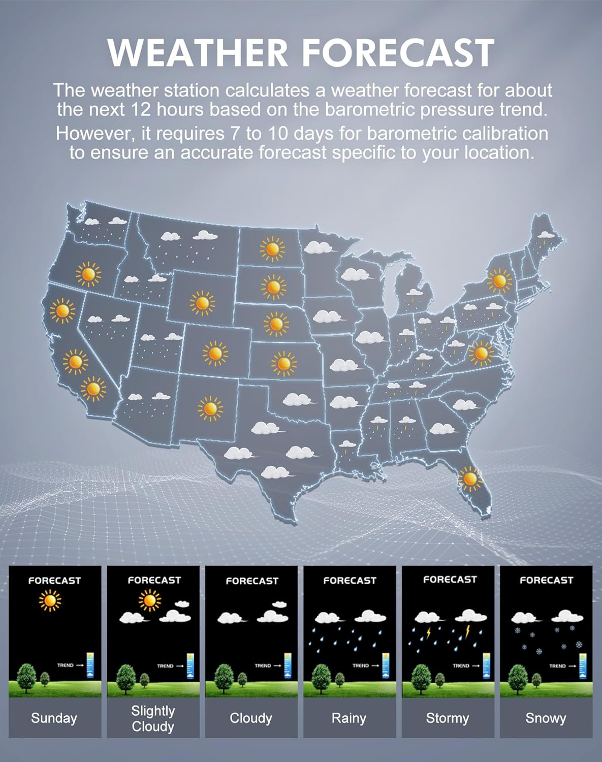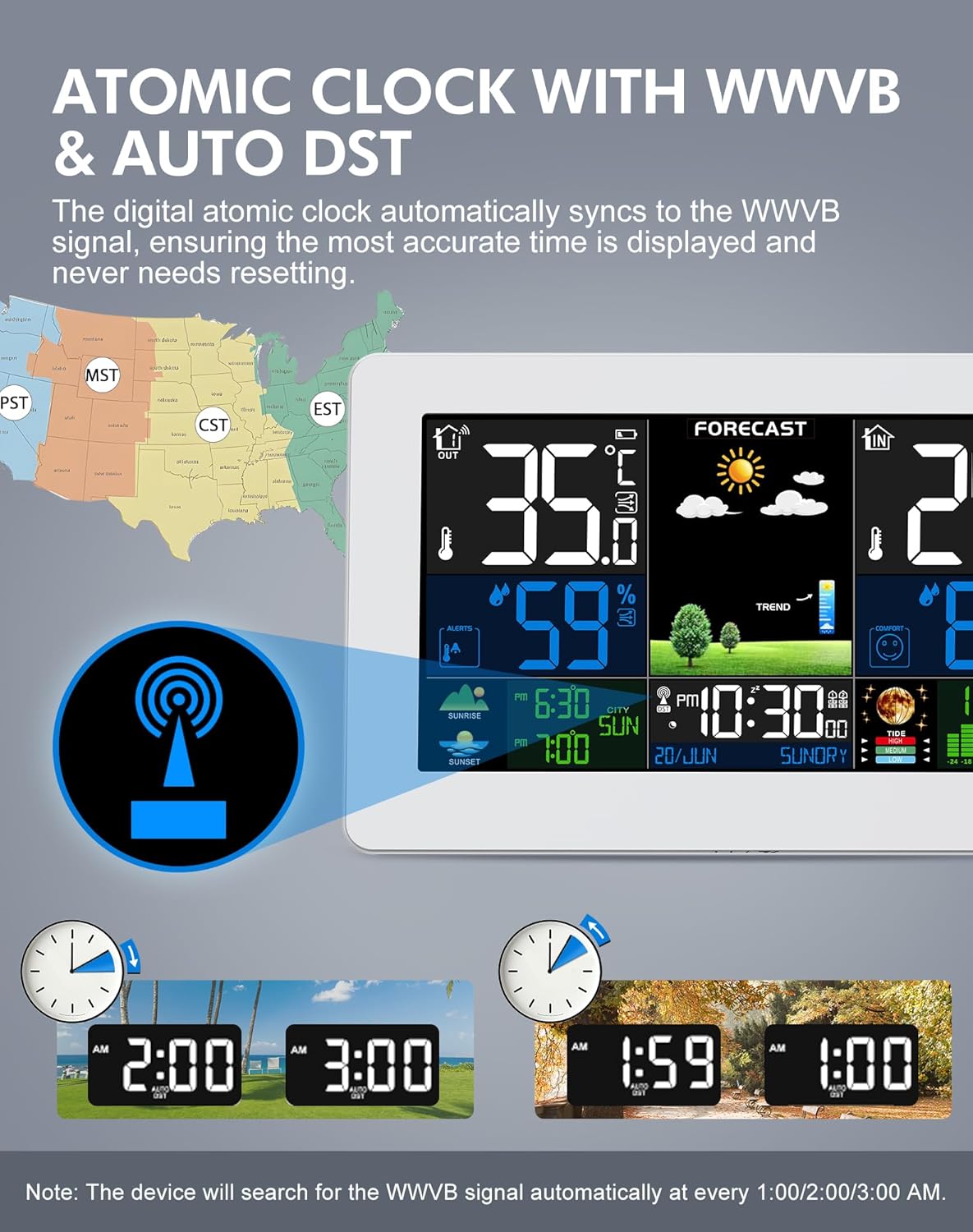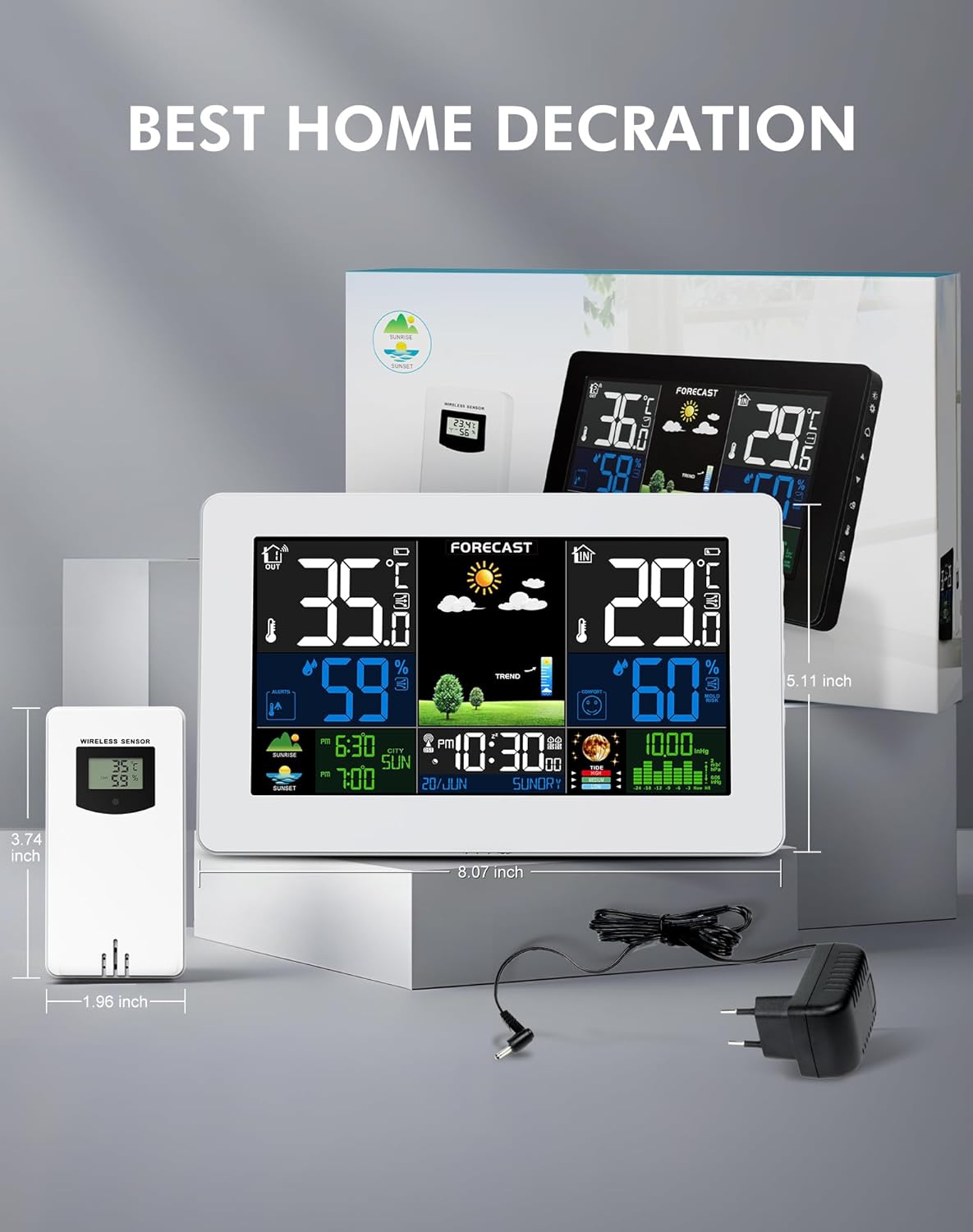 - 【Hohe Präzision】 Mit dem integrierten intelligenten Temperatur- und Luftfeuchtigkeitssensor kann die Wetterstation die Innentemperatur und Luftfeuchtigkeit genau und schnell überwachen. Innentemperaturanzeige von -9,9 °C bis +50 °C,