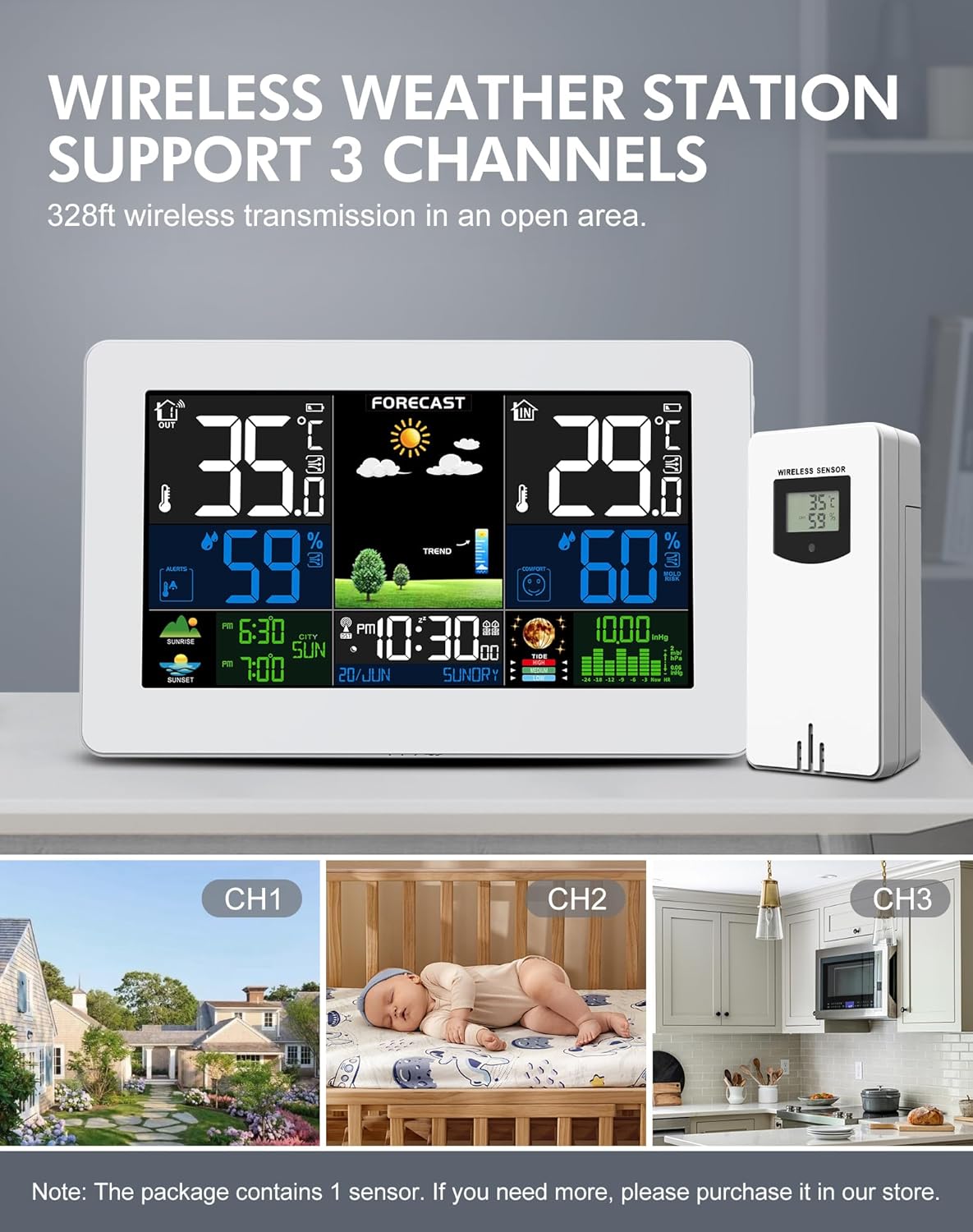 - 【Externer Sensor und 60 m kabellose Übertragung】 Die kabellose Wetterstation ist mit einem externen Sensor ausgestattet und kann drei kabellose Sensoren gleichzeitig unterstützen. Der Sensor überwacht die Umgebungstemperatur und Luftfeuchtigkeit