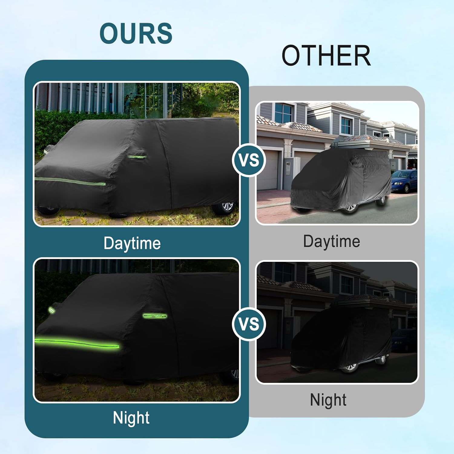 - Durchdachtes Design: Die Öffnung mit Reissverschluss erleichtert die Montage und ermöglicht den Zugang zur Fahrer- und Beifahrertür. Reflektierende Streifen auf der Autoabdeckung können die Leute wissen lassen, wo das Fahrzeug auch im Dunkeln geparkt