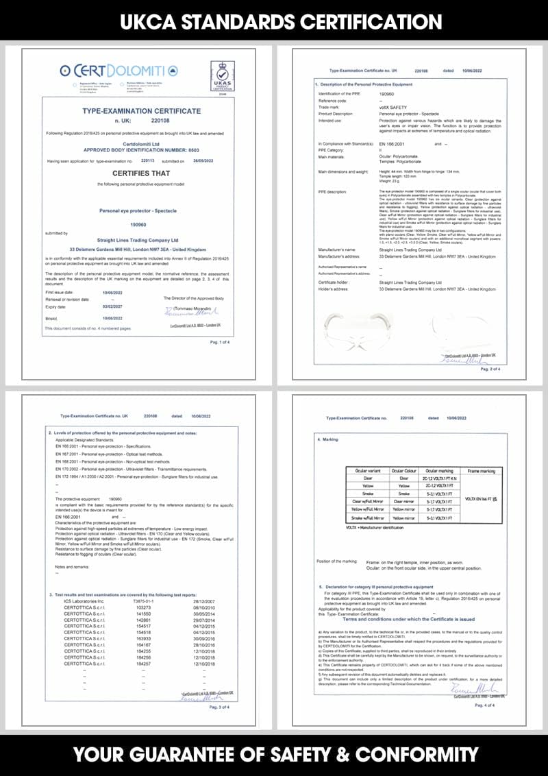 - EN166f zertifiziert, Fassung und Scheibe gekennzeichnet. Entspricht EU Bestimmungen zur Anwendung im Industrierahmen innerhalb der EU.