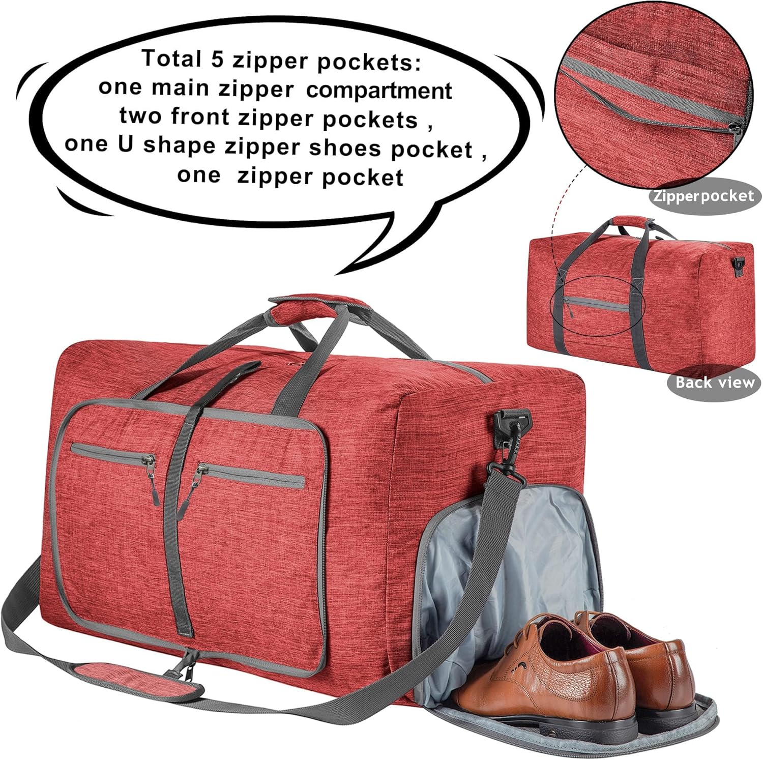 - Viele fächer, ein hauptfach, ein schuhfach, vier reissverschlusstaschen und ein trolleyfach auf der rückseite.