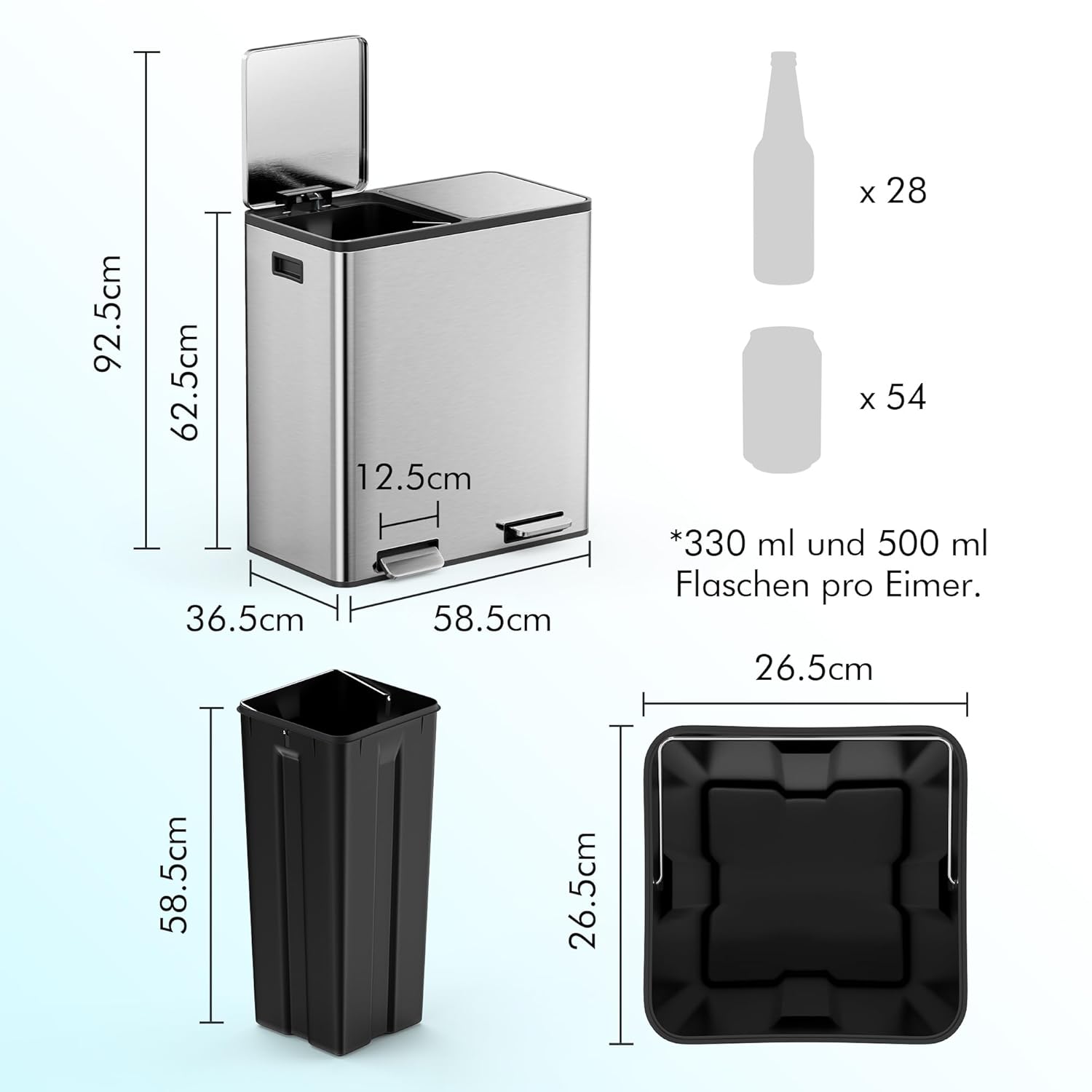 - MÜLLEIMER 2 FÄCHER 2x30L FÜR 60L KAPAZITÄT: Grosses Fassungsvermögen für weniger häufiges Leeren der Mülleimer. Masse: H 62,5 x B 58,5 x T 36,5 cm – passt in jede Küche.