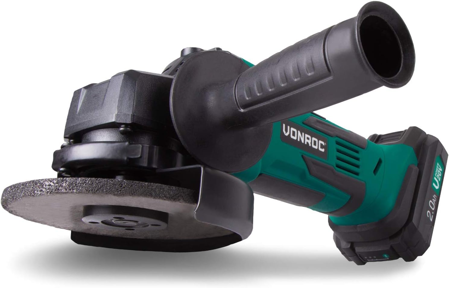 VONROC Akku-Winkelschleifer VPower 20V, 2.0Ah - 115mm - Komplettset mit Akku, Schnellladegerät, Seit