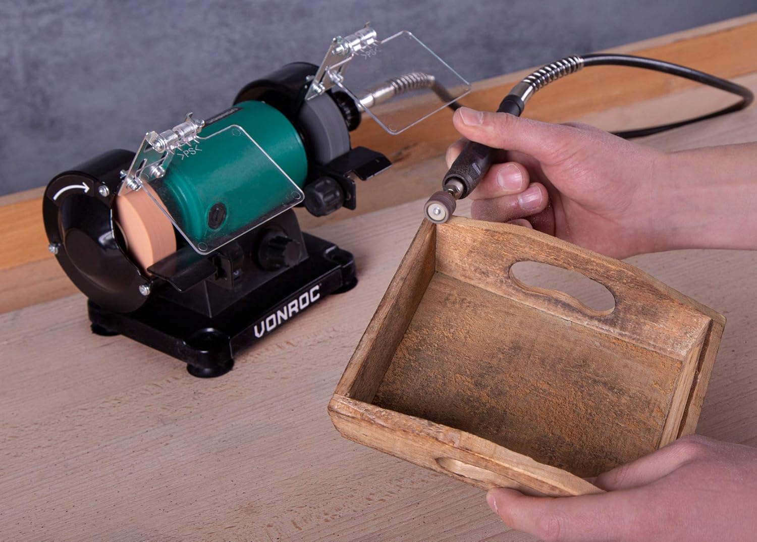 - Mit diesem Allround-Werkbankschleifer können Sie verschiedene kleine Schleif-, Schmirgel-, Polier- und Reinigungsarbeiten im Haushalt, in der Werkstatt oder im Schuppen durchführen.