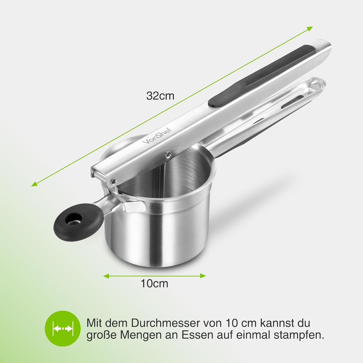 • FÜR GROssE MENGEN: Verabschiede dich von Klumpen in deinem Kartoffelbrei mit der VonShef Kartoffelpresse aus Edelstahl. Mit einem Durchmesser von 10 cm sparst du Zeit und Energie.