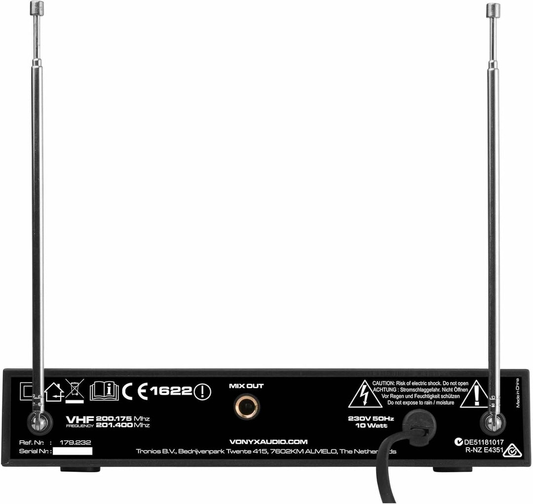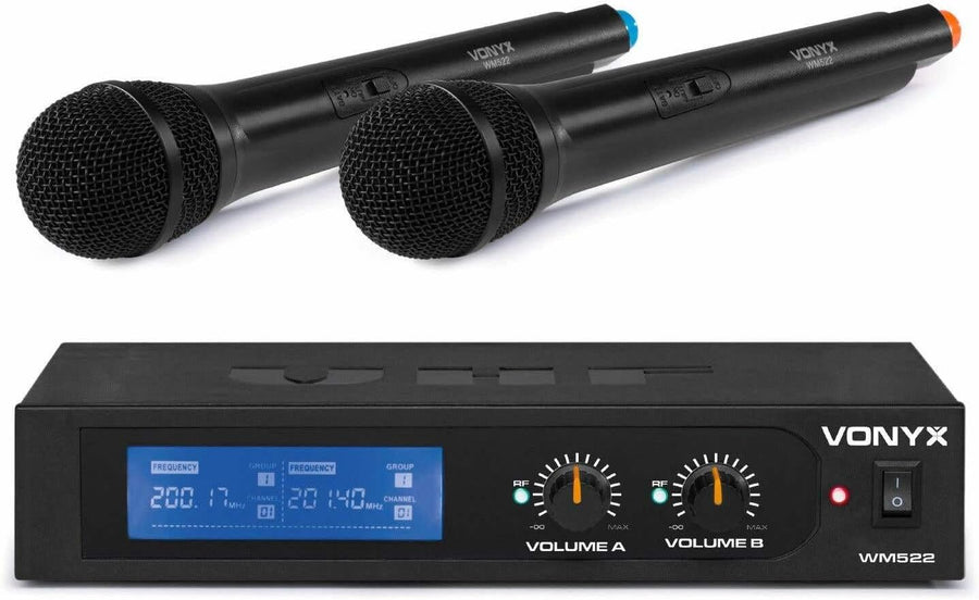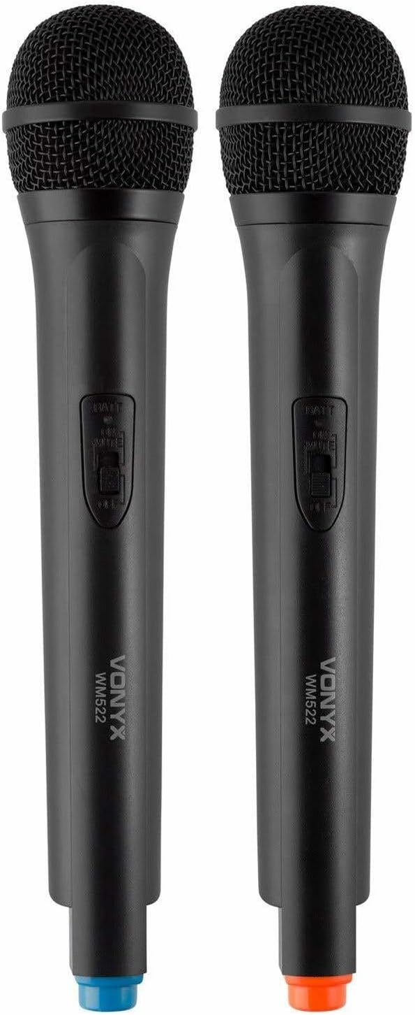 - Das Vonyx WM522 DJ Mikrofon ist ein preiswertes drahtloses Mikrofonset mit zwei drahtlosen Handmikrofonen. Das System arbeitet im VHF-Band und bietet eine gute Tonqualität und stabile Signalübertragung.