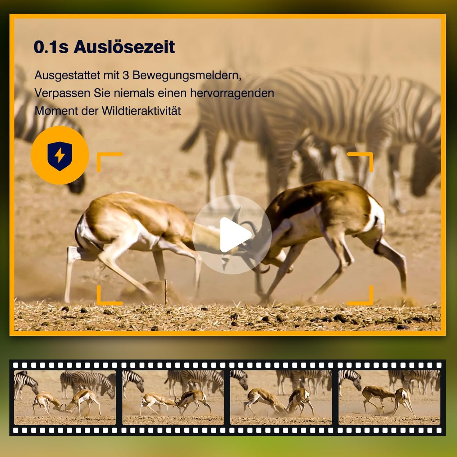 • 【MP4 H.265-Videoaufnahme】Die Wildkamera mit handyübertragung app kann Videos mit 4K @ 30fps, 2,7K @ 30fps, 2K @ 60fps, etc. aufnehmen. Fortschrittliche H.265-Videoaufzeichnung mit Sound, klarere Wiedergabe und spart bis zu 80 % des