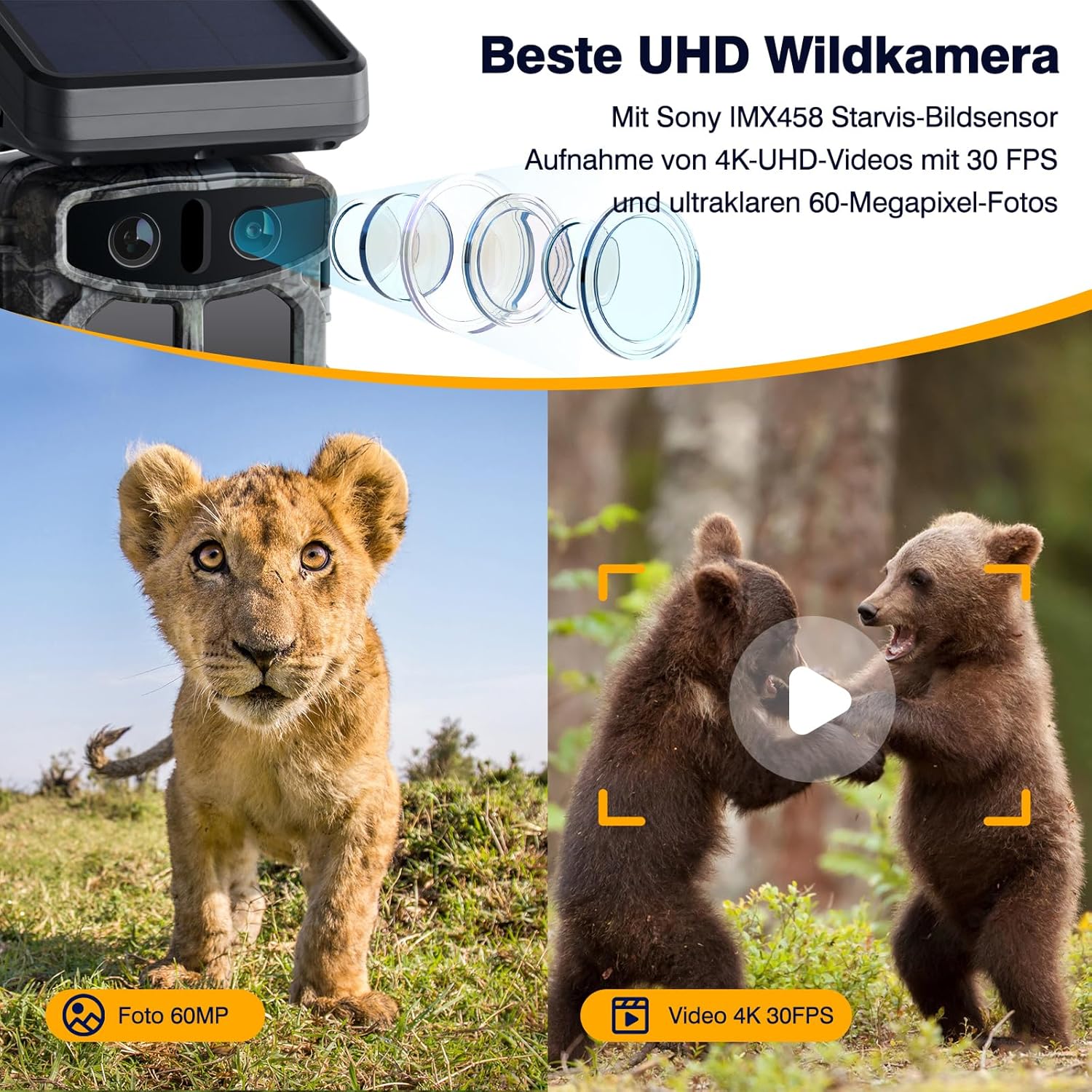 VOOPEAK Solar Wildkamera Duales Objektiv, 4K 60MP Wildkamera WLAN Sternenlicht Nachtsicht, Wildtierk