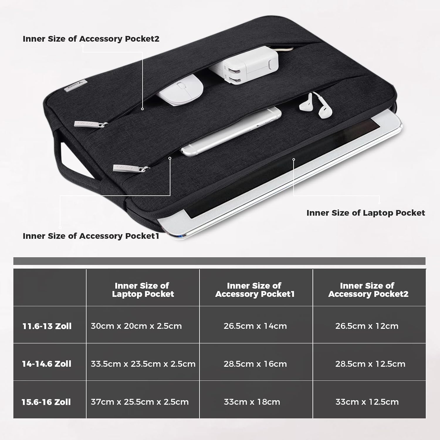 - 【Grösse】 ✔Innenraum: 30,5×21,5×2cm ✔Aussen: 32,5×24×2,5cm ✔Geeignet für 11,6-13,6 Zoll Laptops und Tablets. ✔Bitte überprüfen Sie vor dem Kauf die Masse Ihres Laptops im Vergleich zu den Innenmassen unserer Laptoptaschen.