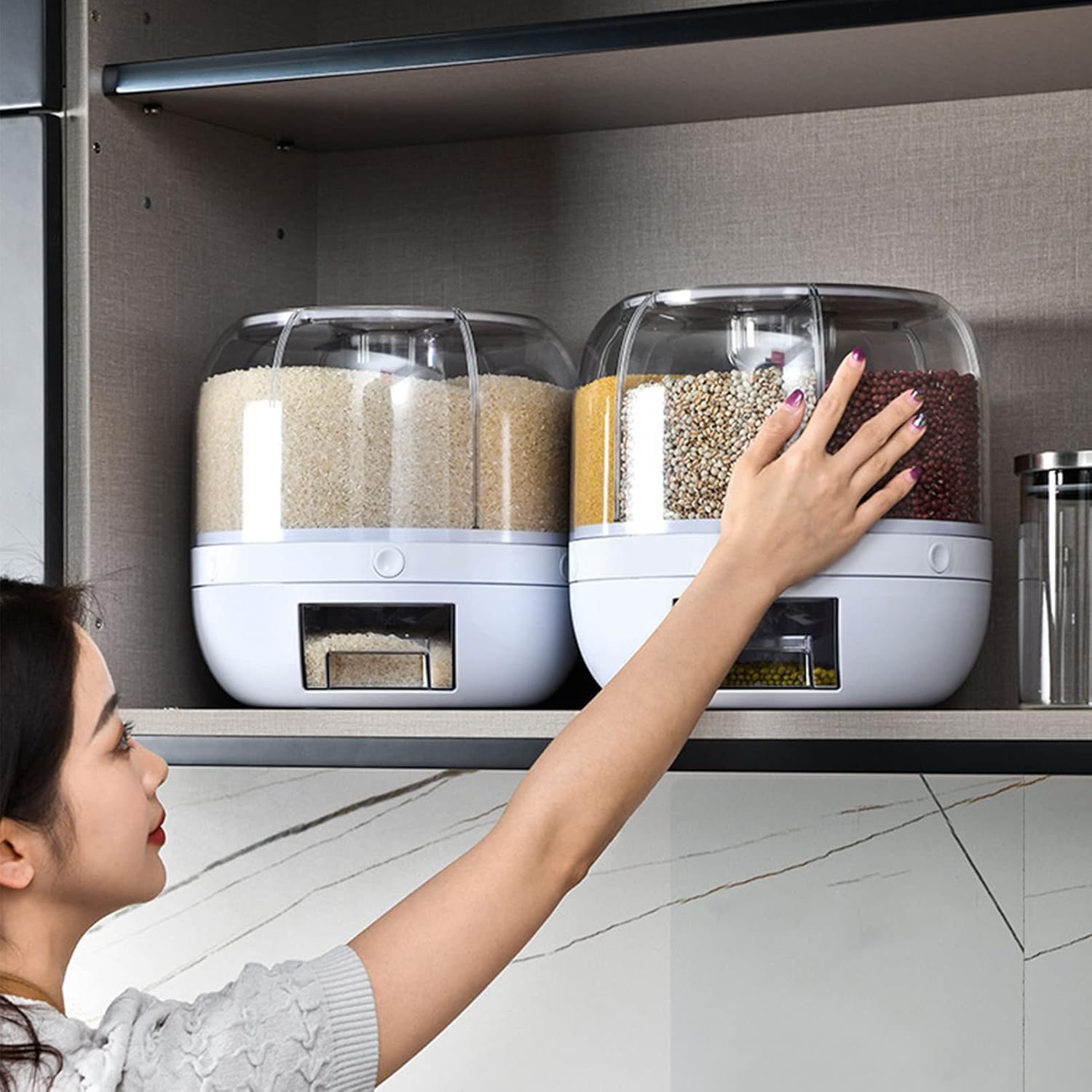 - Drehbares Design: Dieser drehbare Reisspender ist in multifunktionale Müsligläser mit 6 Gittern unterteilt. In einem Behälter können 6 Getreidearten aufbewahrt werden. Und es hat eine starke Tragfähigkeit von bis zu 5 kg und kann den Bedürfnissen
