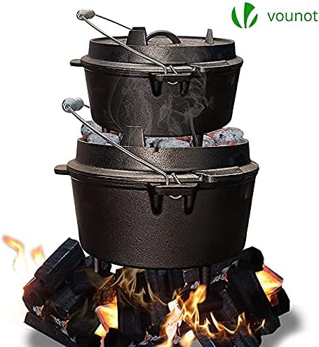 - Unser VOUNOT Dutch Oven ist der aus hochwertigem hitzebeständigem Gusseisen hergestellt ist. Der Feuertopf ist bereits eingebrannt (pre-seasoned) und sofort nutzbar. Dank den Standfüssen kann der Deckel auch umgedreht und als Pfanne verwendet werden.